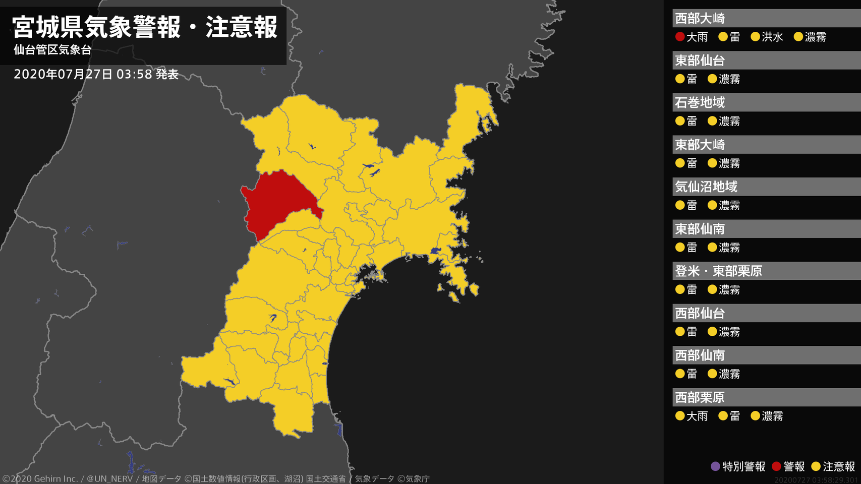 【宮城県 気象警報・注意報 2020年07月27日 03:19】西部では、土砂災害や河川の増水に注意してください。宮城県では、落雷や濃霧による視程障害に注意してください。#気象警報注意報 #宮城県