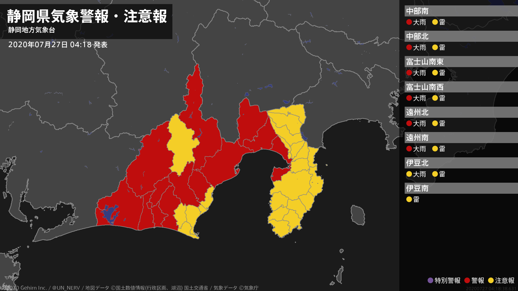 【静岡県 気象警報 2020年07月27日 04:18】中部、東部、西部では、27日昼前まで土砂災害に警戒してください。#気象警報 #気象警報注意報 #静岡県