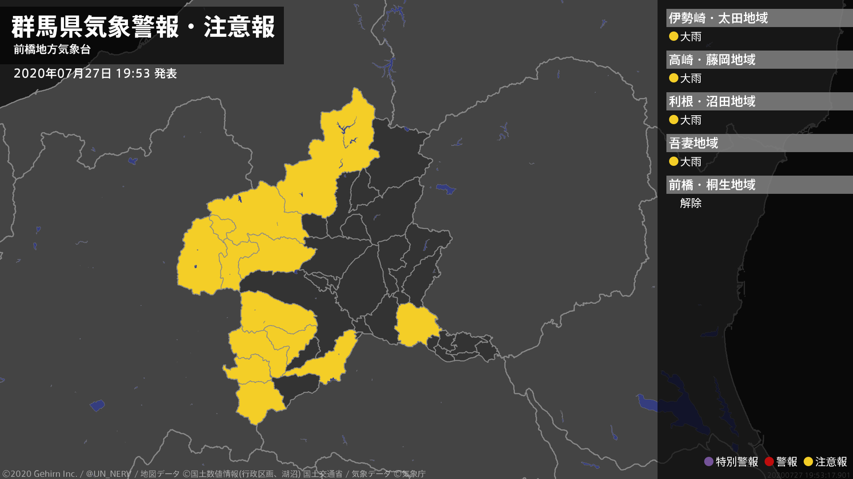 【群馬県 気象警報・注意報 2020年07月27日 19:53】