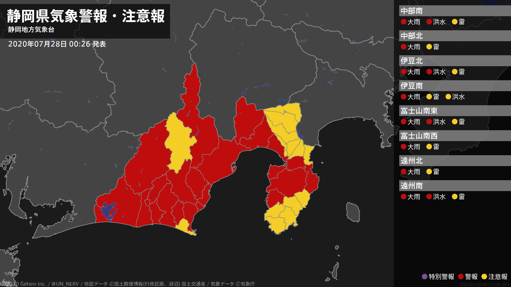 【静岡県 気象警報 2020年07月28日 00:02】静岡県では、28日明け方まで土砂災害や河川の増水に警戒してください。中部、伊豆、西部では、28日明け方まで低い土地の浸水に警戒してください。#気象警報 #気象警報注意報 #静岡県