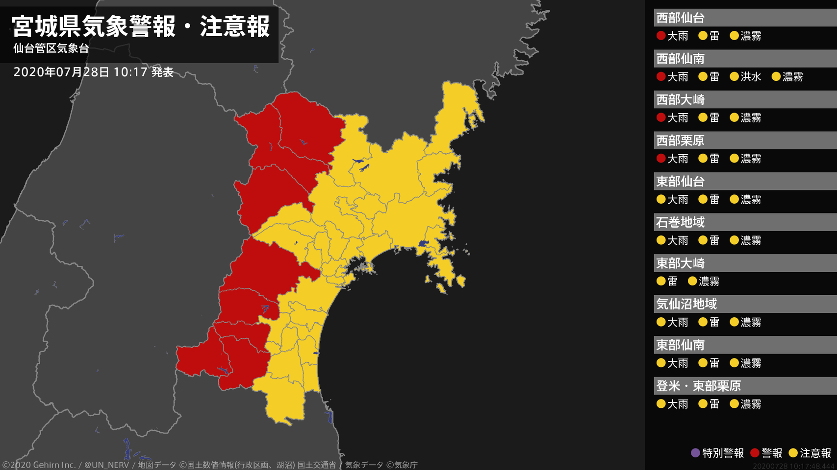 【宮城県 気象警報 2020年07月28日 10:17】西部では、28日夜遅くまで土砂災害に警戒してください。#気象警報 #気象警報注意報 #宮城県