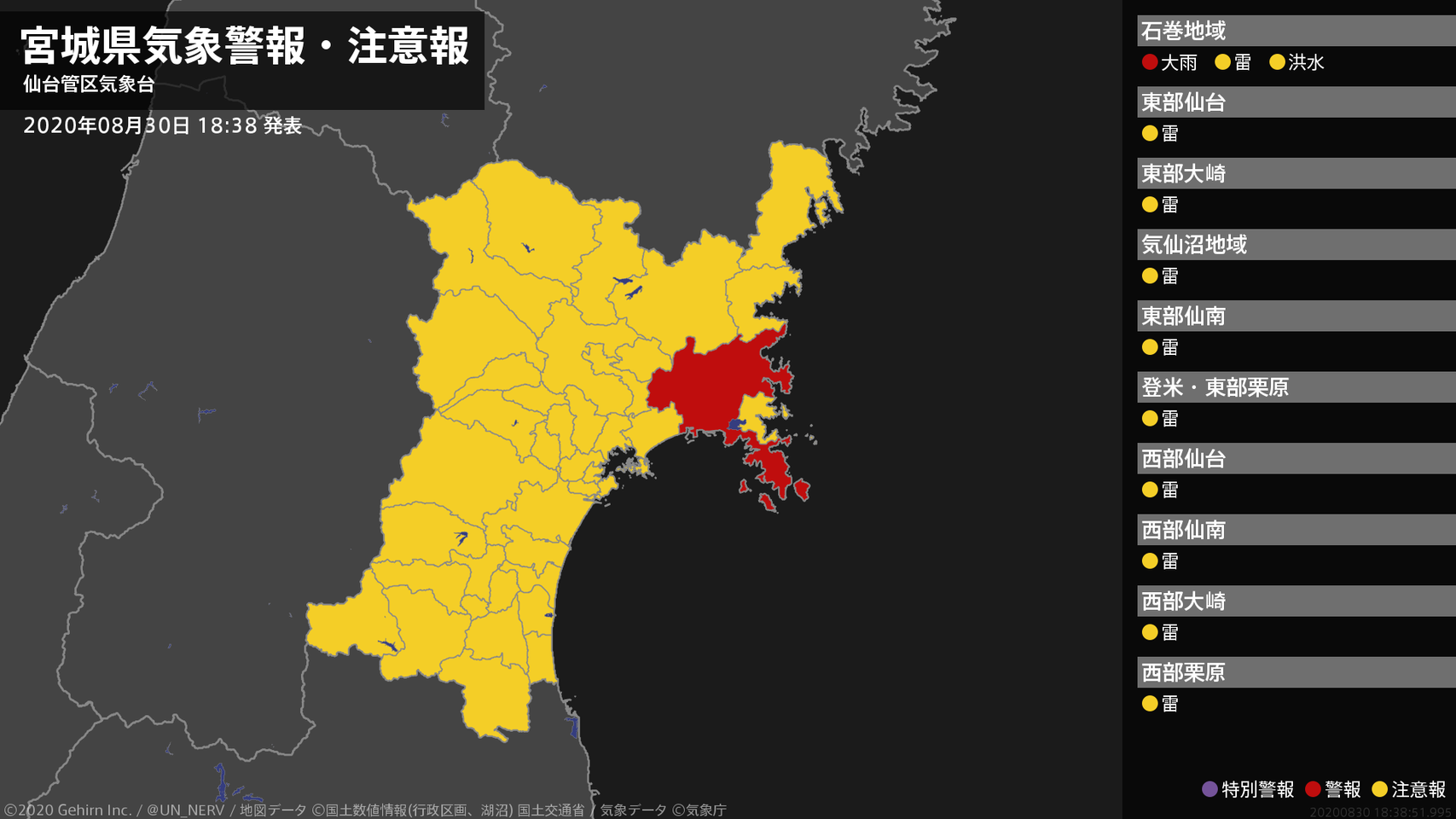 【宮城県 気象警報・注意報 2020年08月30日 18:38】東部では、30日夜遅くまで土砂災害に、30日夜のはじめ頃まで低い土地の浸水に警戒してください。#気象警報注意報 #宮城県