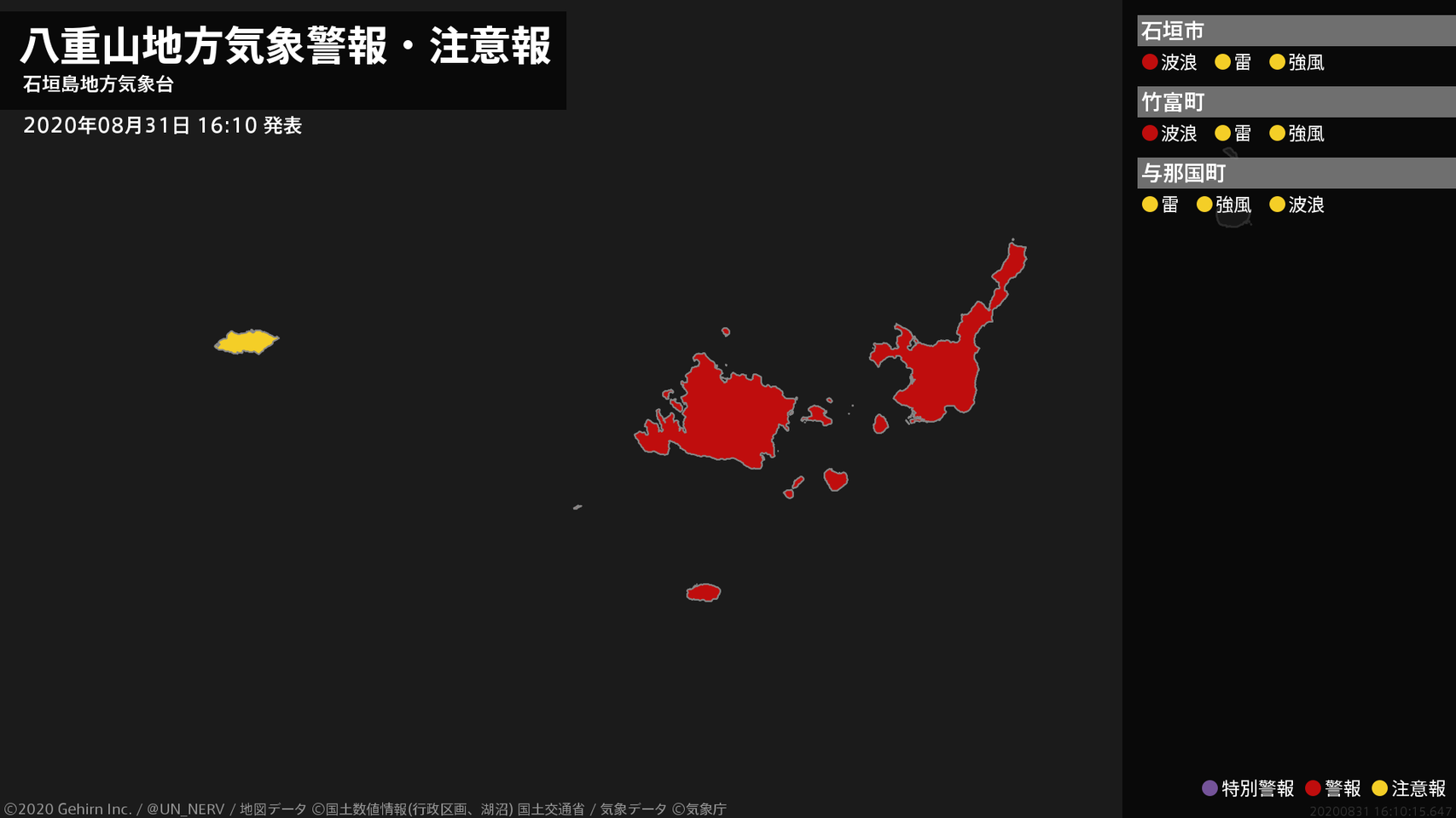 【八重山地方 気象警報 2020年08月31日 16:10】石垣島地方では、31日夜遅くから高波に警戒してください。#気象警報 #気象警報注意報 #八重山地方