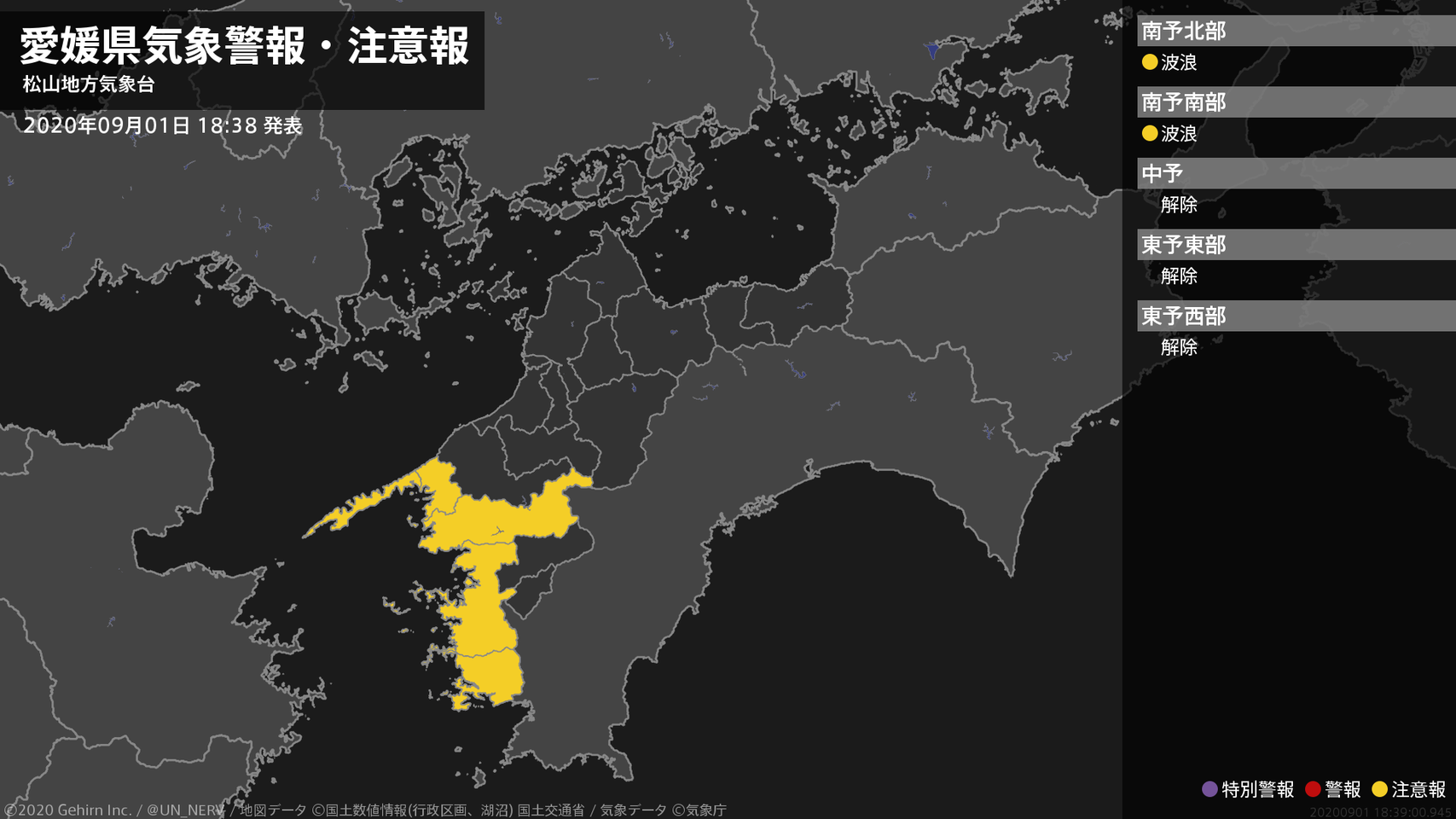 【愛媛県 気象警報・注意報 2020年09月01日 18:39】