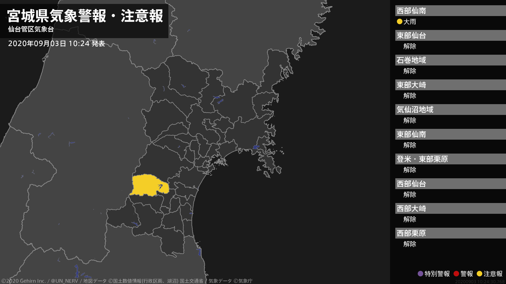 【宮城県 気象警報・注意報 2020年09月03日 10:24】西部では、3日夜遅くまで土砂災害に注意してください。#気象警報注意報 #宮城県