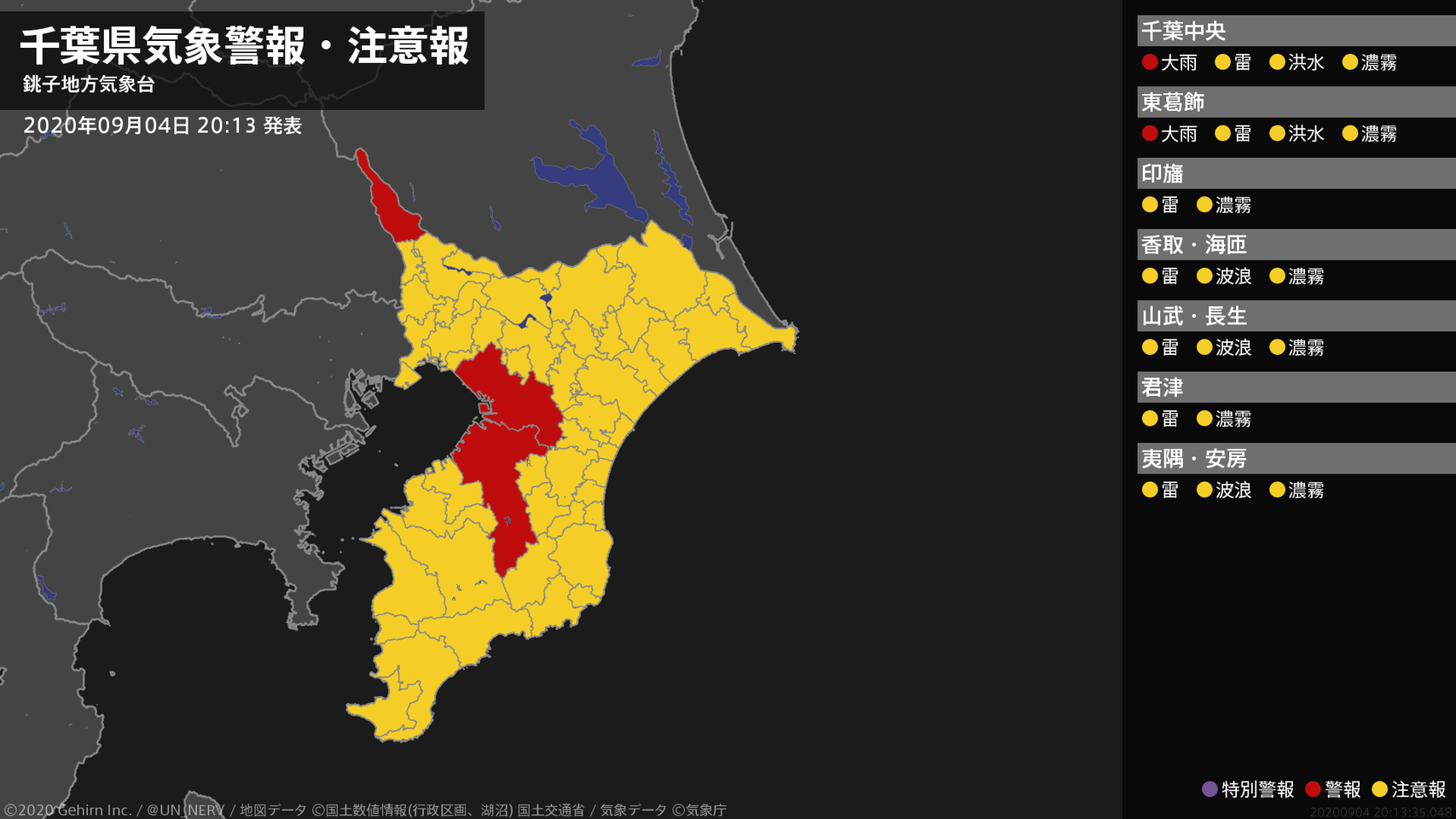 【千葉県 気象警報 2020年09月04日 20:32】北西部では、4日夜遅くまで低い土地の浸水や河川の増水に警戒してください。#気象警報 #気象警報注意報 #千葉県
