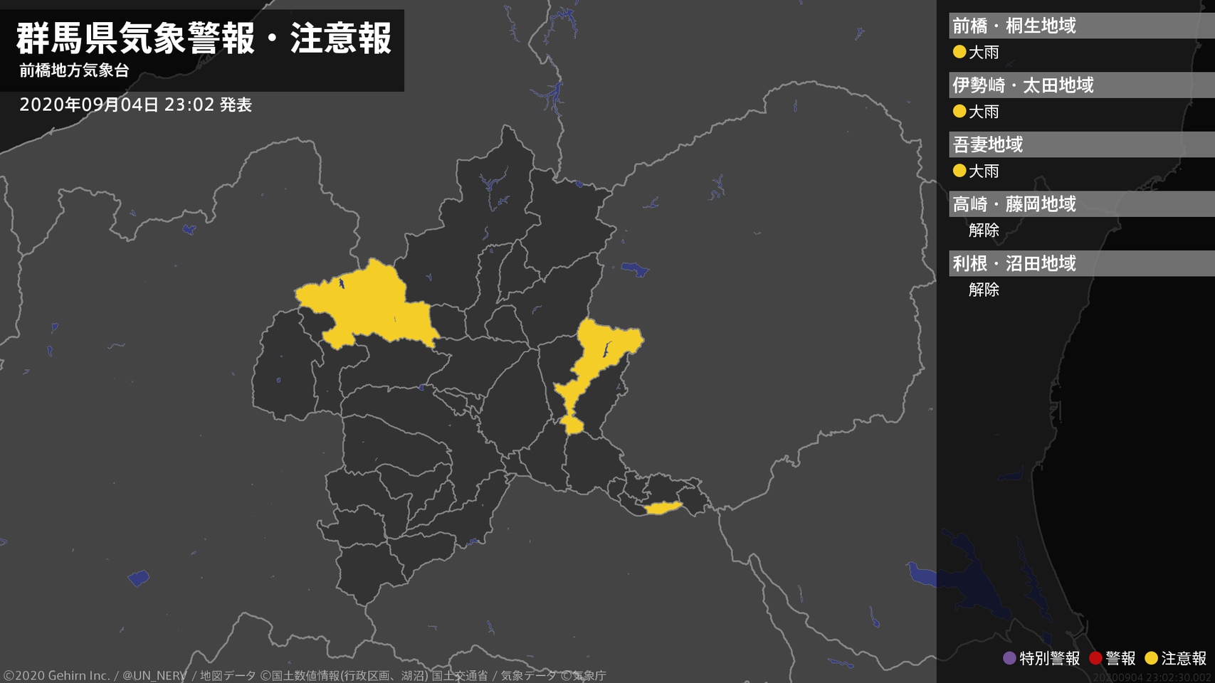 【群馬県 気象警報・注意報 2020年09月04日 23:02】