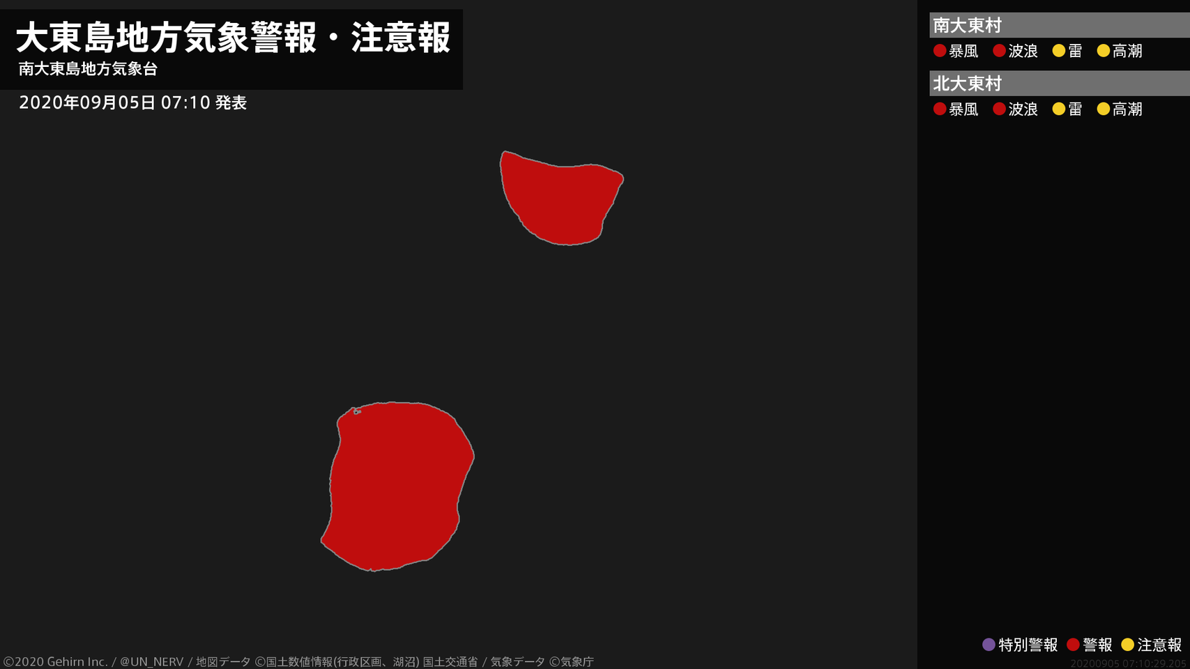 【大東島地方 気象警報・注意報 2020年09月05日 07:10】大東島地方では、暴風や高波に警戒してください。#気象警報注意報 #大東島地方