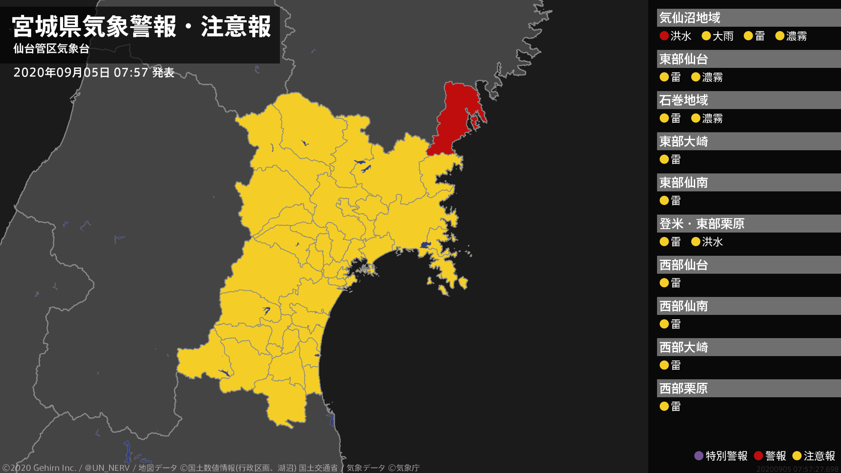 【宮城県 気象警報・注意報 2020年09月05日 07:39】東部では、5日夕方まで土砂災害に、5日昼前まで河川の増水や濃霧による視程障害に注意してください。宮城県では、5日夕方まで落雷に注意してください。#気象警報注意報 #宮城県