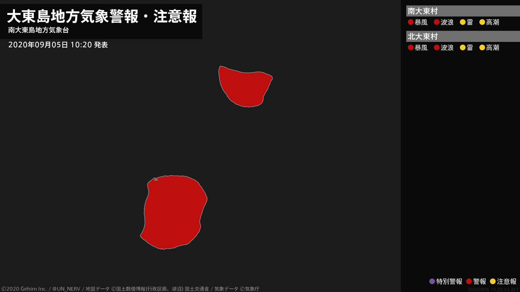 【大東島地方 気象警報・注意報 2020年09月05日 10:20】大東島地方では、暴風や高波に警戒してください。#気象警報注意報 #大東島地方