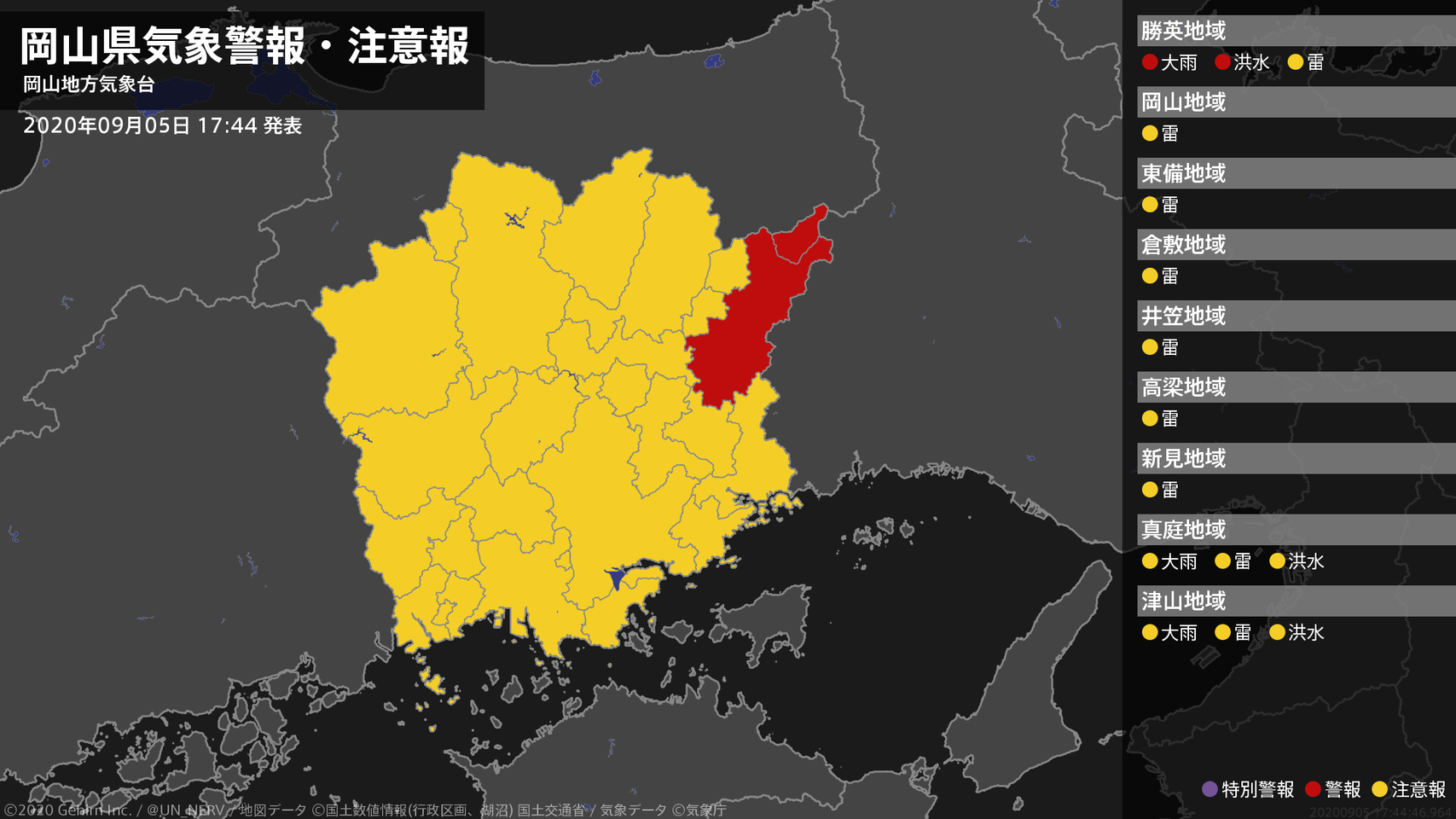 【岡山県 気象警報・注意報 2020年09月05日 17:44】北部では、5日夜遅くまで土砂災害や低い土地の浸水、河川の増水に警戒してください。#気象警報注意報 #岡山県