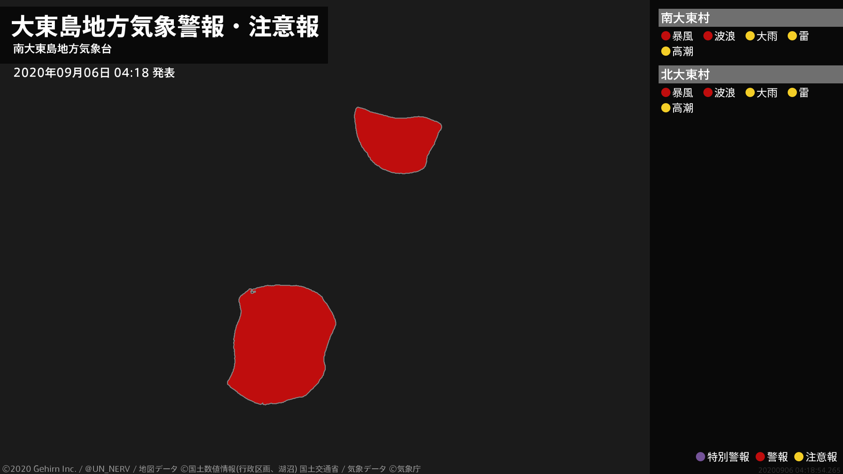 【大東島地方 気象警報・注意報 2020年09月06日 04:18】大東島地方では、6日昼前まで暴風に、6日夜遅くまで高波に警戒してください。#気象警報注意報 #大東島地方
