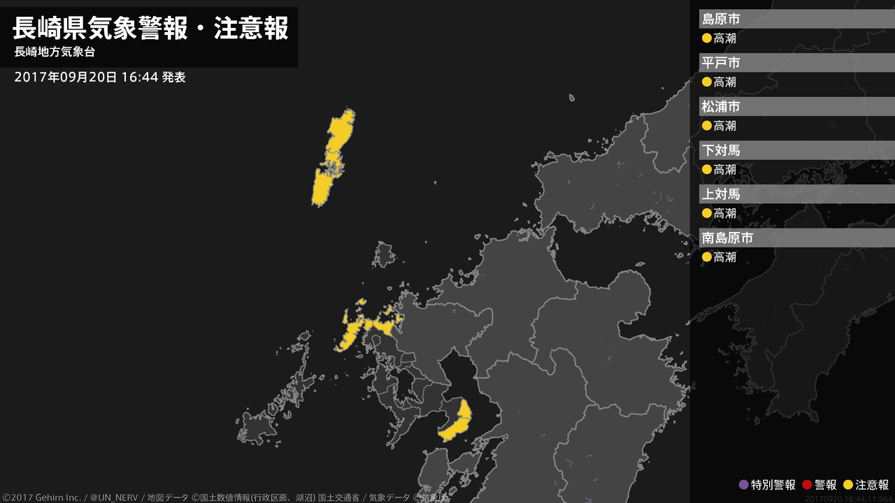 【長崎県 気象警報・注意報 2017年09月20日 16:44】南部、北部、壱岐・対馬では、22日まで高潮に注意してください。#気象警報注意報 #長崎県