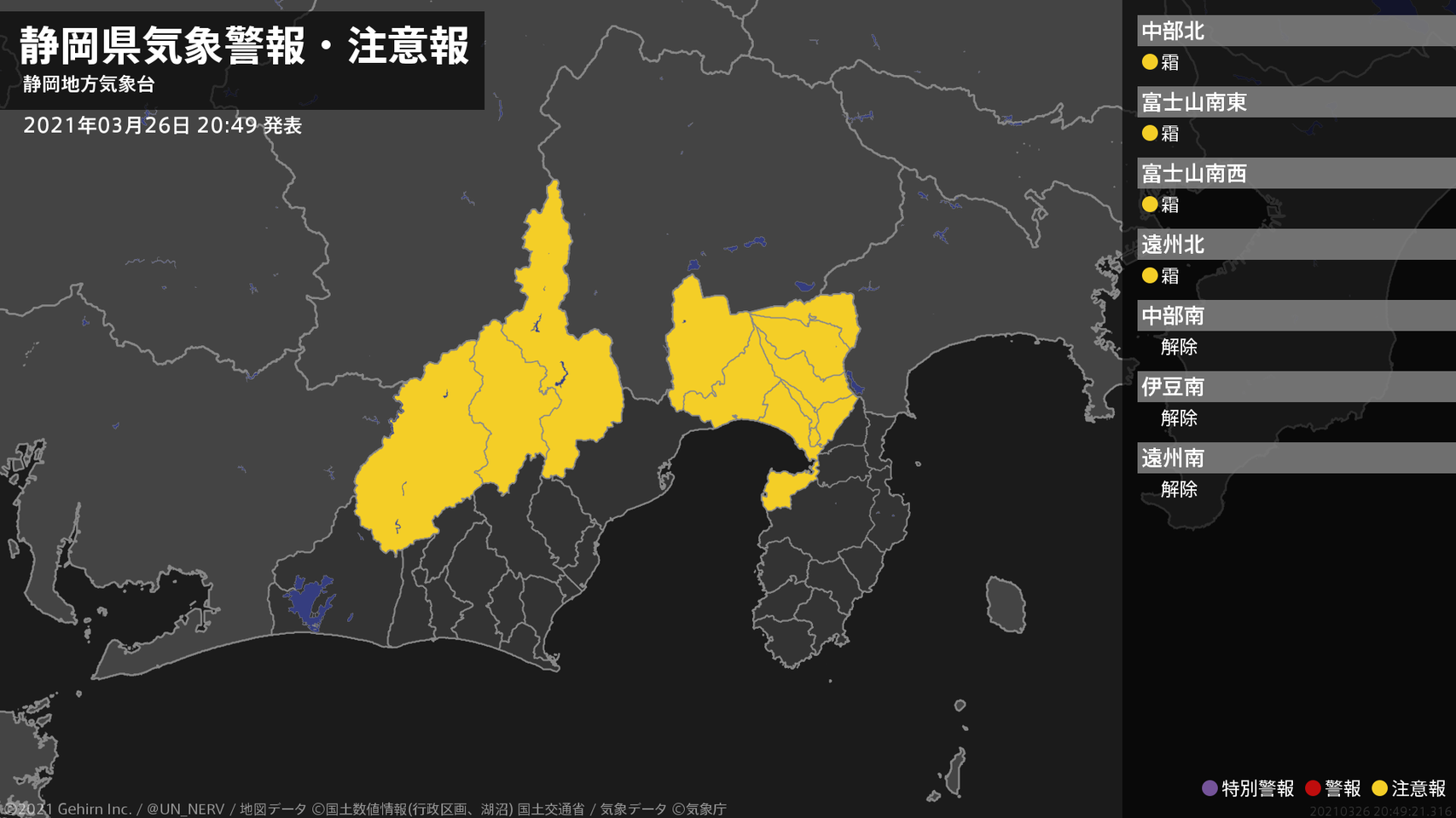 【静岡県 気象警報・注意報 2021年03月26日 20:49】中部、東部、西部では、27日朝は霜に対する農作物の管理に注意してください。#気象警報注意報 #静岡県