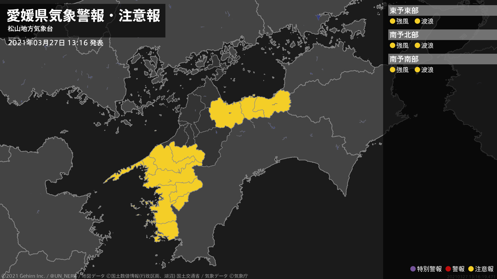 【愛媛県 気象警報・注意報 2021年03月27日 13:16】東予、南予では、27日夜のはじめ頃から、強風や高波に注意してください。東予東部では、27日夜のはじめ頃からやまじ風のおそれがあります。#気象警報注意報 #愛媛県