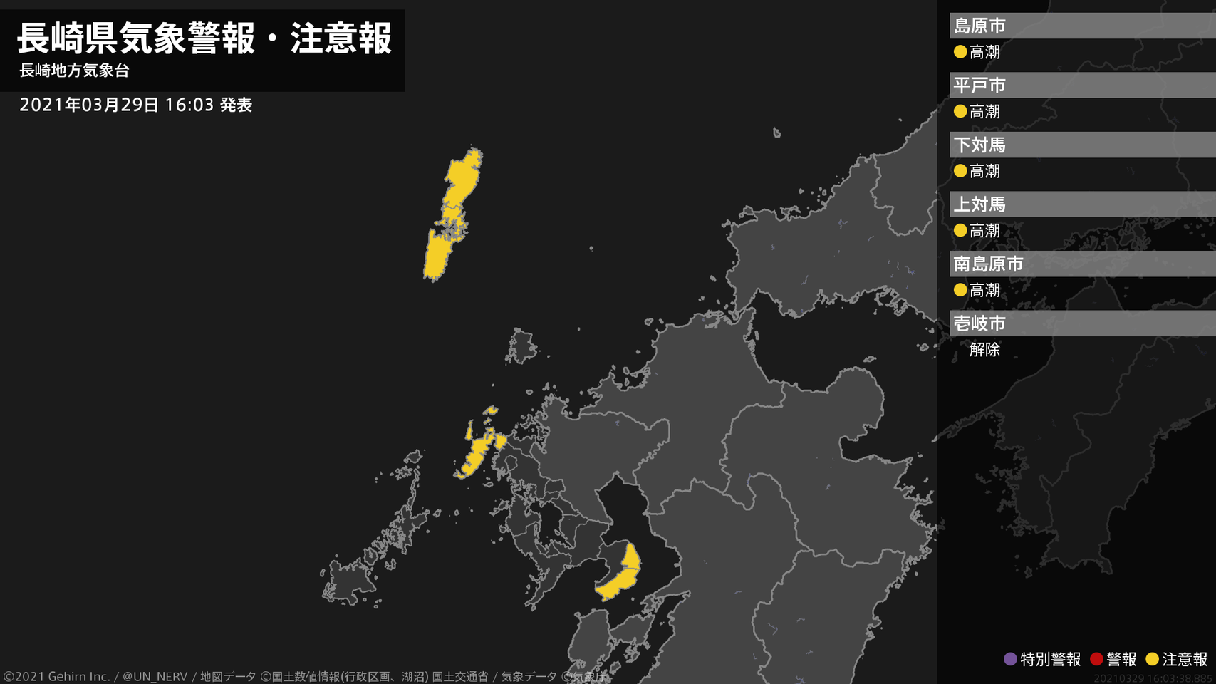 【長崎県 気象警報・注意報 2021年03月29日 16:03】南部、北部、壱岐・対馬では、30日まで高潮に注意してください。#気象警報注意報 #長崎県
