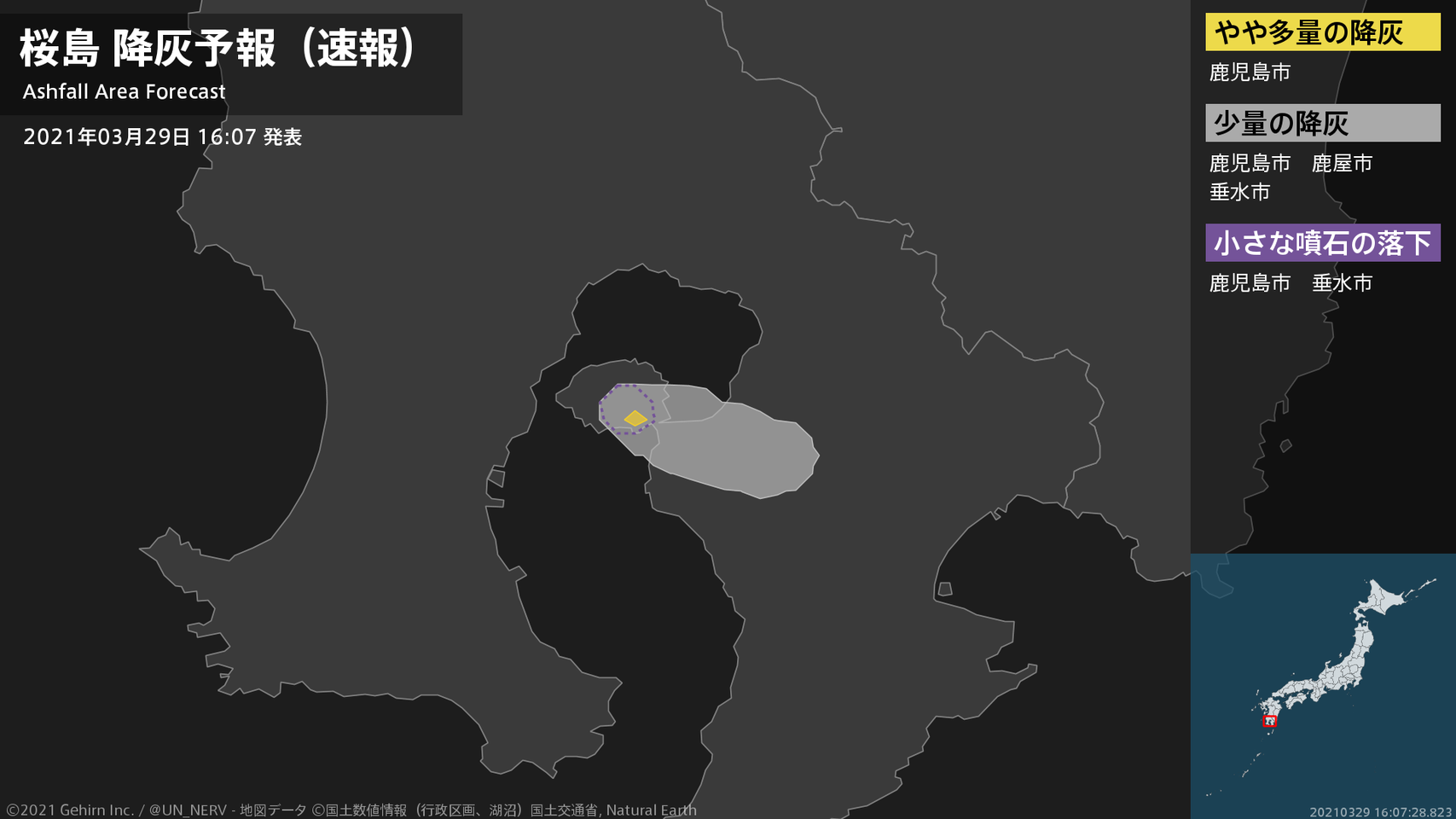 【桜島 降灰予報(速報)】1時間以内に鹿児島市(桜島)ではやや多量の降灰があり、降灰は鹿児島県鹿屋市まで予想されます。また、火口から南東方向およそ4kmまでの範囲では、小さな噴石が風に流されて降るおそれがあります。#降灰予報(速報)