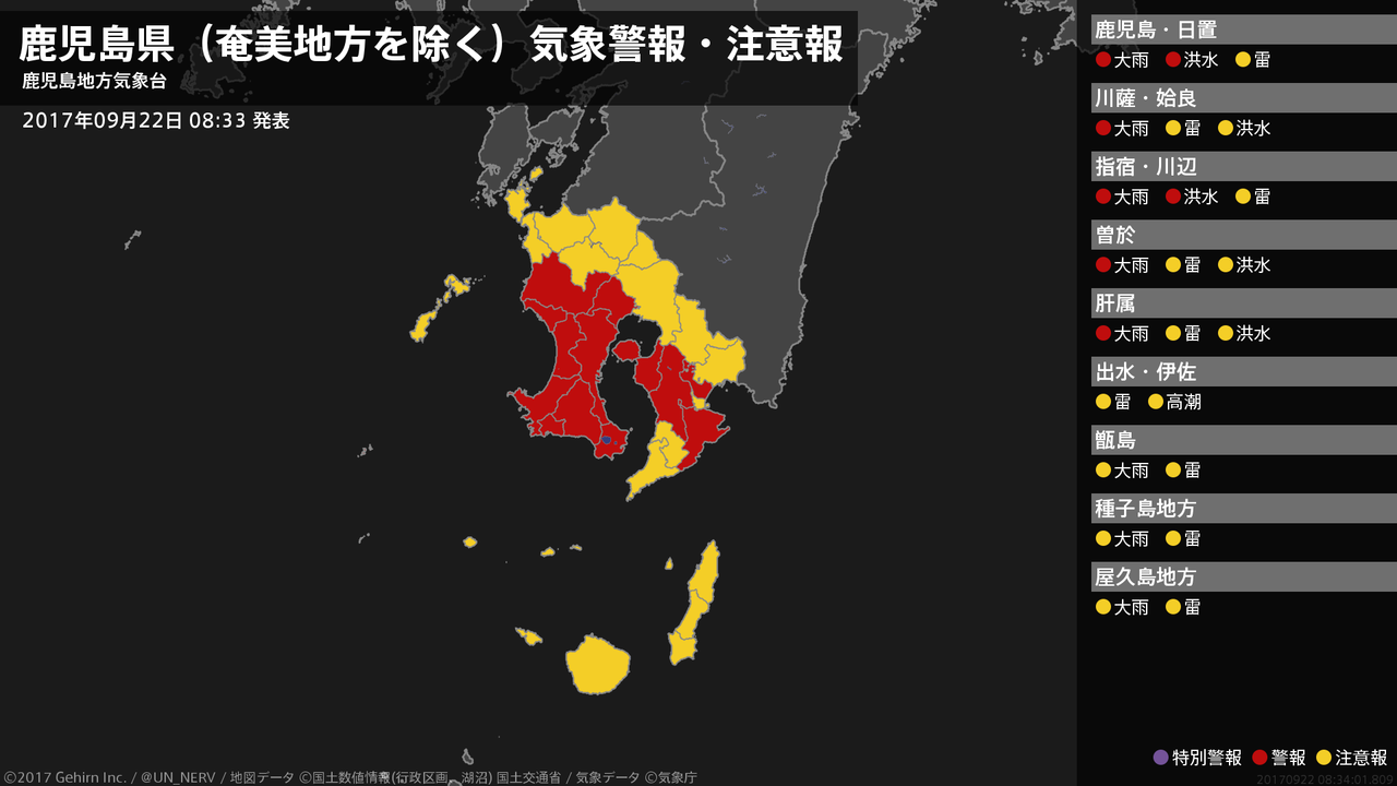 【鹿児島県(奄美地方を除く) 気象警報 2017年09月22日 08:34】