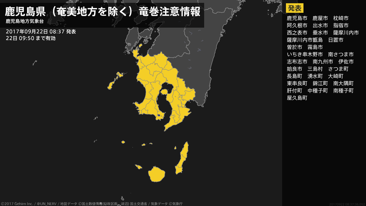 【鹿児島県(奄美地方を除く) 竜巻注意情報】