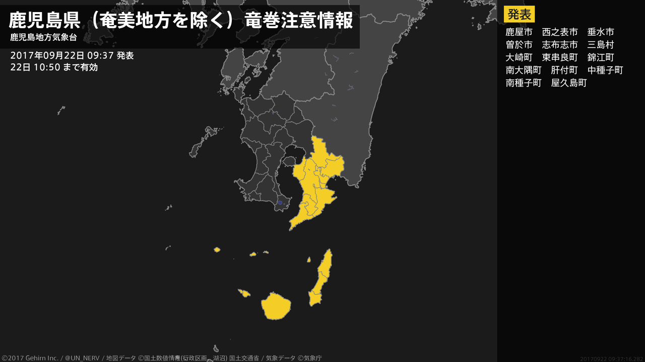【鹿児島県(奄美地方を除く) 気象警報 2017年09月22日 09:53】
