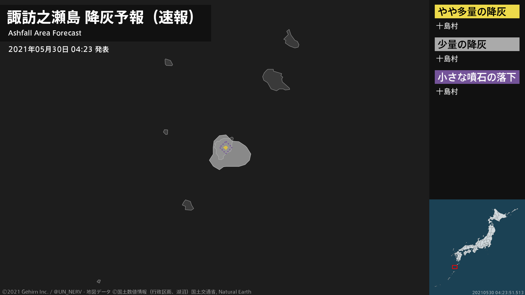 【諏訪之瀬島 降灰予報(速報)】1時間以内に十島村ではやや多量の降灰があり、降灰は鹿児島県十島村まで予想されます。また、火口から東方向およそ1kmまでの範囲では、小さな噴石が風に流されて降るおそれがあります。#降灰予報(速報)