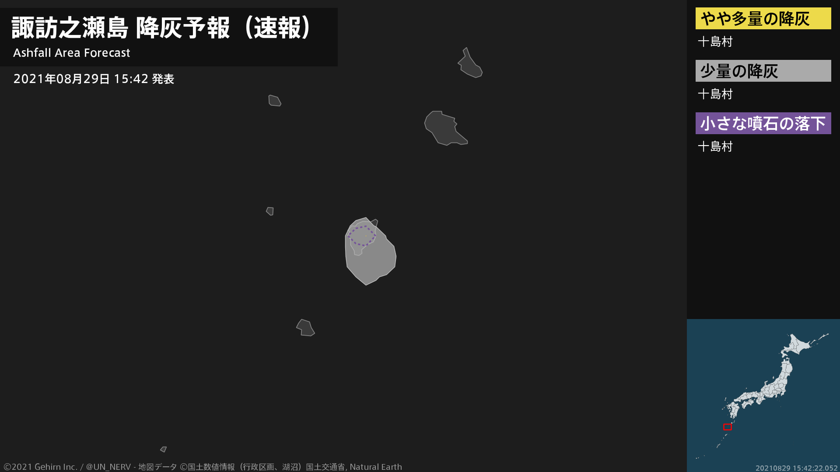 1時間以内に十島村ではやや多量の降灰があり、降灰は鹿児島県十島村まで予想されます。また、火口から南西方向およそ1kmまでの範囲では、小さな噴石が風に流されて降るおそれがあります。