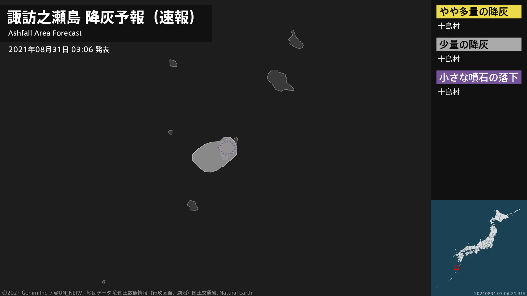 1時間以内に十島村ではやや多量の降灰があり、降灰は鹿児島県十島村まで予想されます。また、火口から南西方向およそ1kmまでの範囲では、小さな噴石が風に流されて降るおそれがあります。