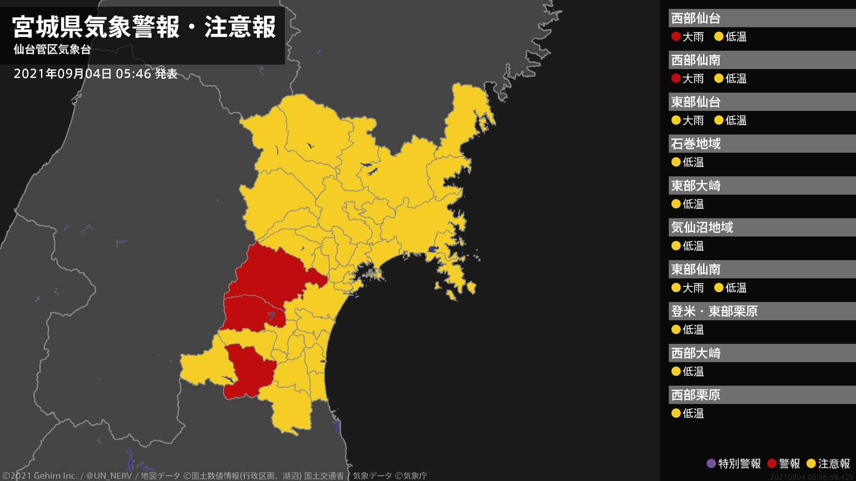 【宮城県 気象警報・注意報 2021年09月04日 05:46】西部では、4日昼前まで土砂災害に警戒してください。#気象警報注意報 #宮城県