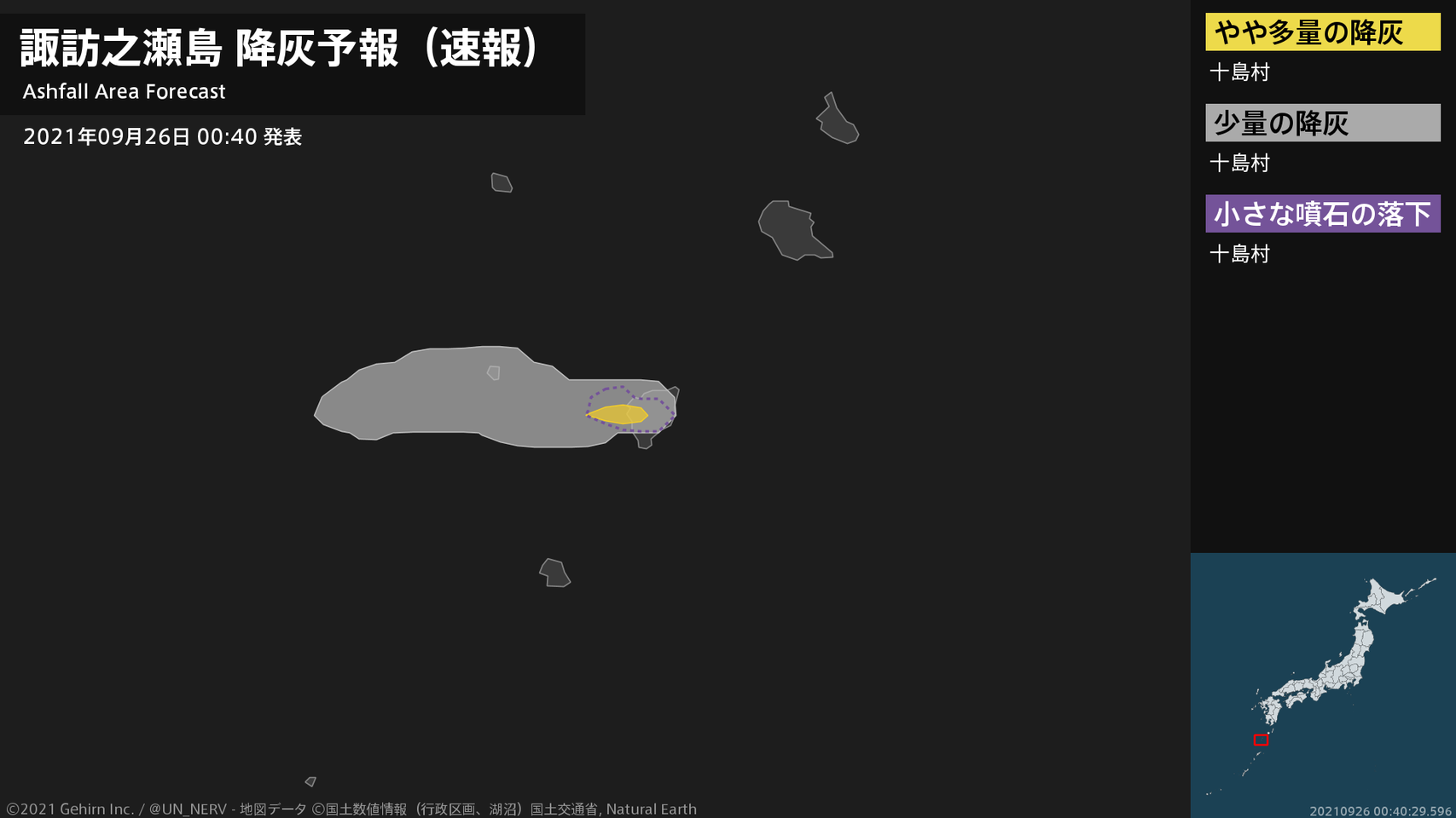 【諏訪之瀬島 噴火に関する火山観測報 2021年09月26日 04:03】26日 03時57分頃、諏訪之瀬島(御岳火口)で噴火がありました。噴煙高度は火口上1800m、噴煙の流向は直上です。#火山 #奄美地方