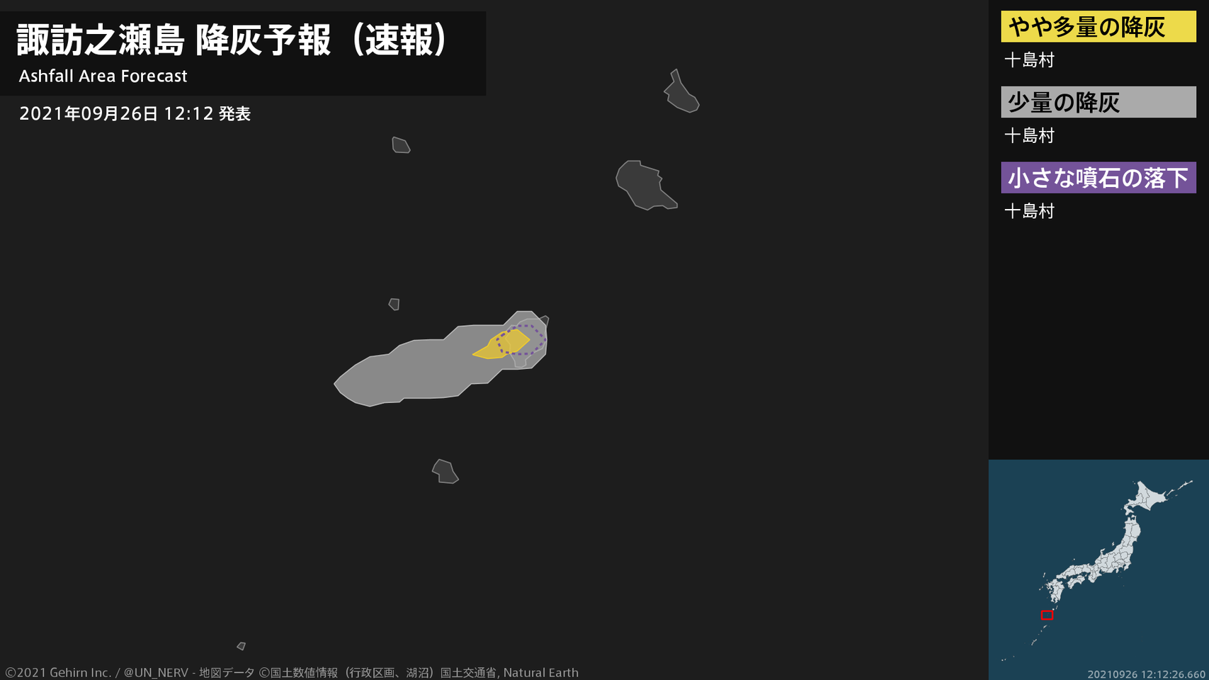 【諏訪之瀬島 噴火に関する火山観測報 2021年09月26日 14:00】26日 13時51分頃、諏訪之瀬島(御岳火口)で爆発がありました。噴煙高度は火口上2200m、噴煙の流向は西です。#火山 #奄美地方