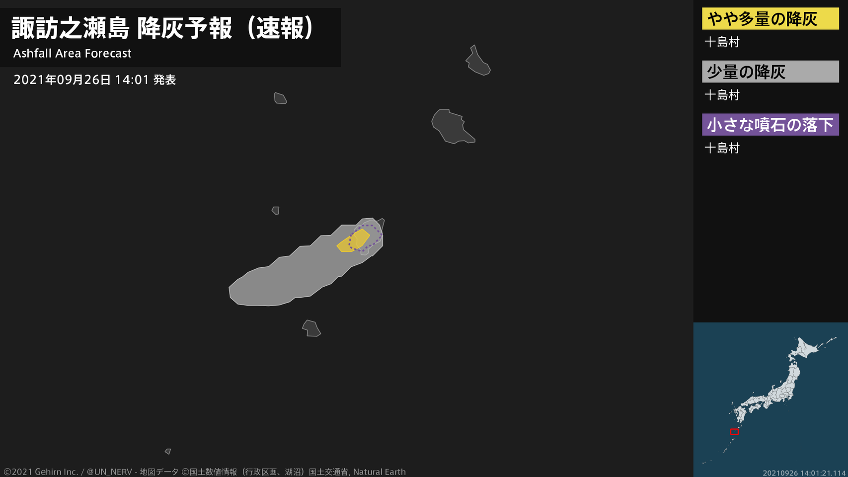 【諏訪之瀬島 噴火に関する火山観測報 2021年09月26日 13:37】26日 13時25分頃、諏訪之瀬島(御岳火口)で噴火がありました。噴煙高度は火口上1900m、噴煙の流向は南西です。#火山 #奄美地方