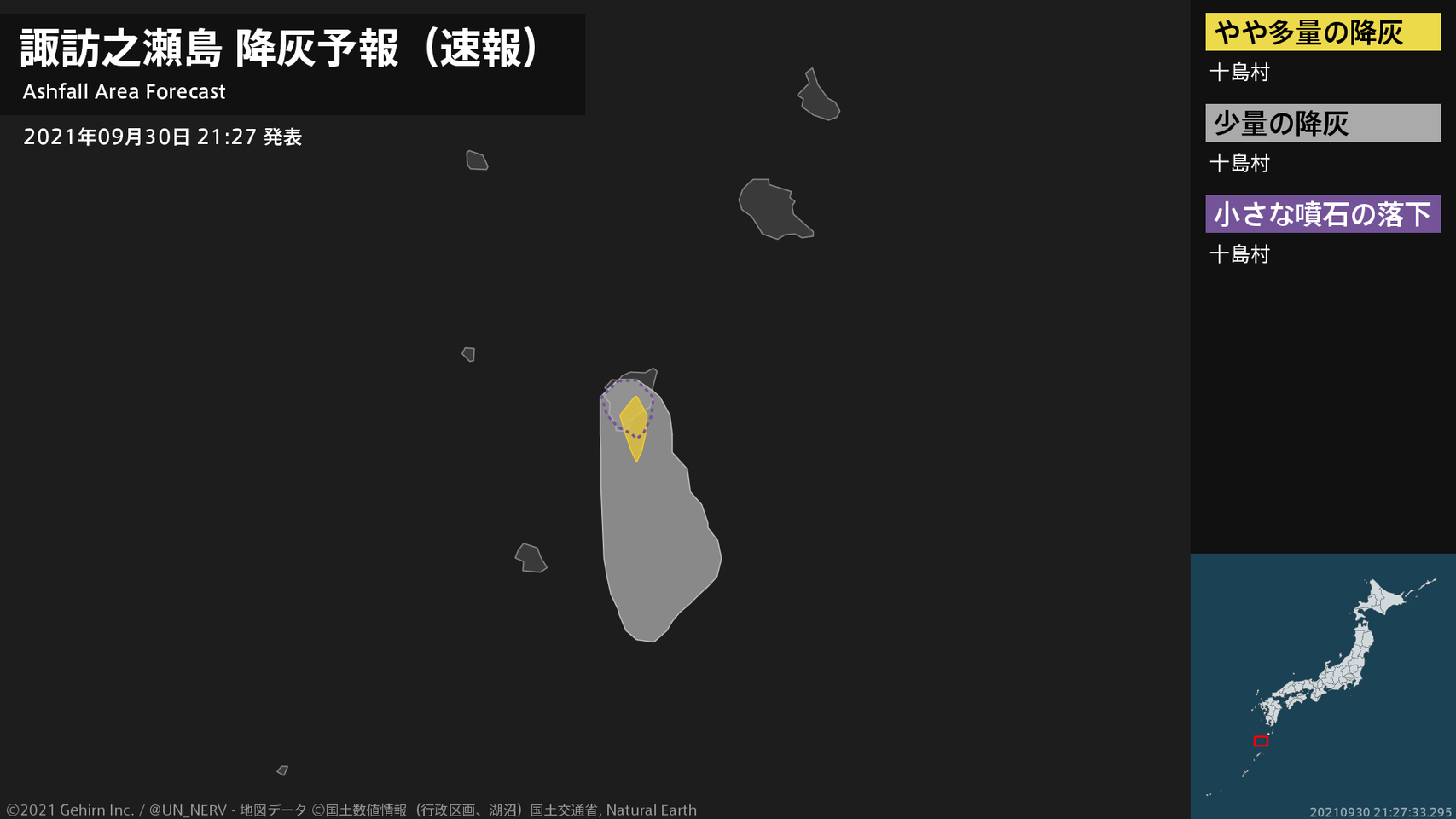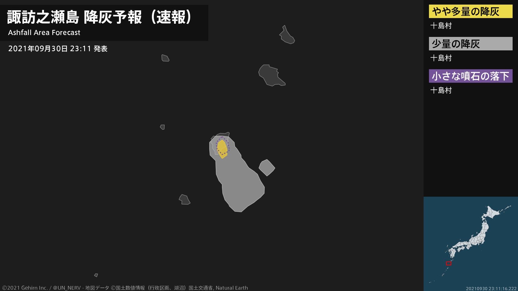 1時間以内に十島村ではやや多量の降灰があり、降灰は鹿児島県十島村まで予想されます。また、火口から南東方向およそ4kmまでの範囲では、小さな噴石が風に流されて降るおそれがあります。