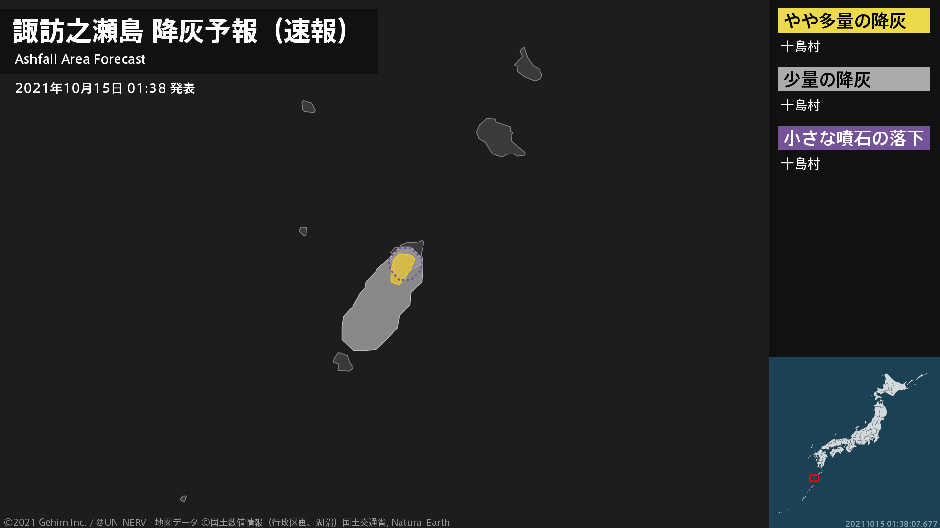【諏訪之瀬島 噴火に関する火山観測報 2021年10月15日 02:38】15日 02時28分頃、諏訪之瀬島(御岳火口)で噴火がありました。噴煙高度は火口上1200m、噴煙の流向は南です。#火山 #奄美地方