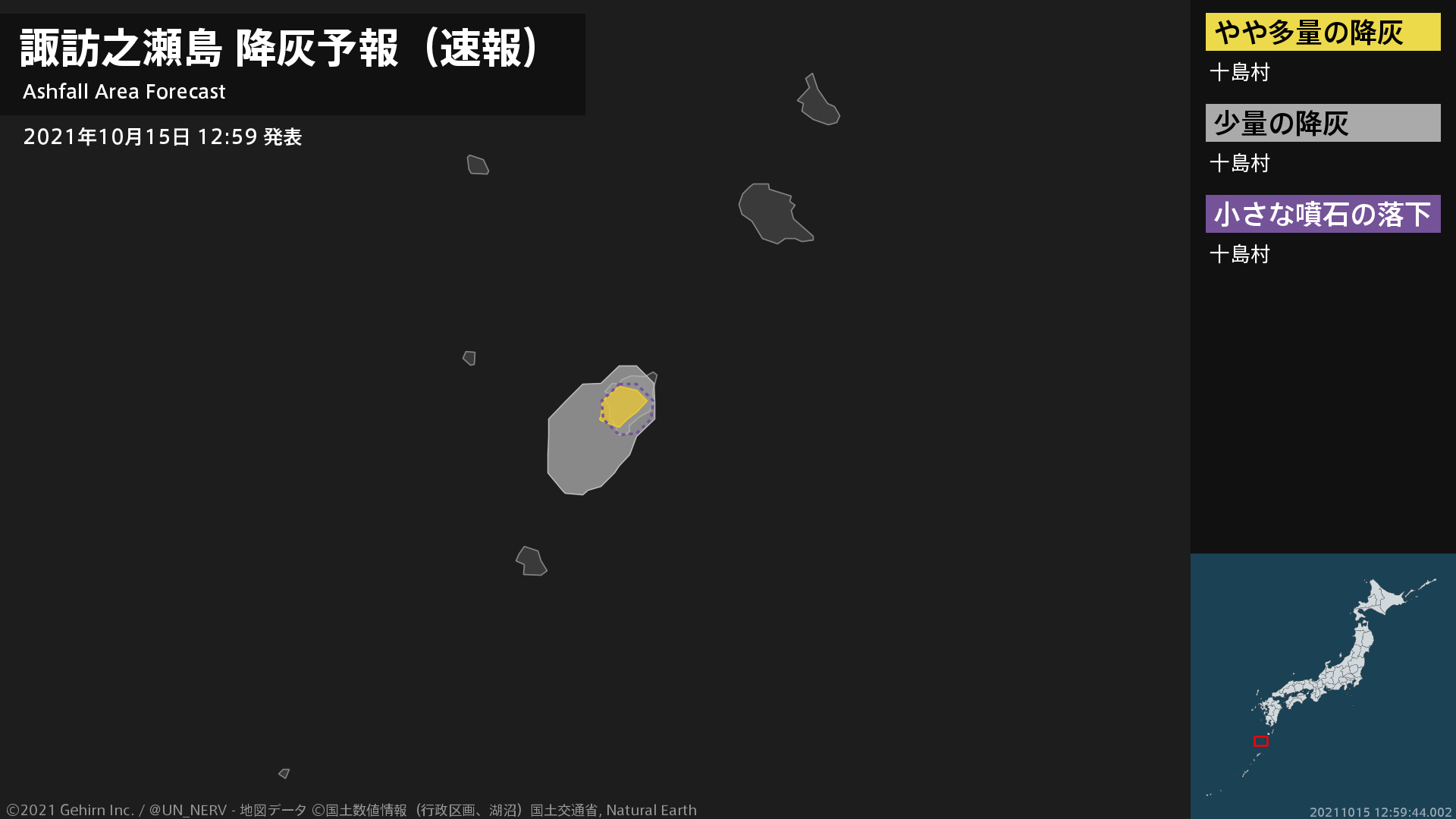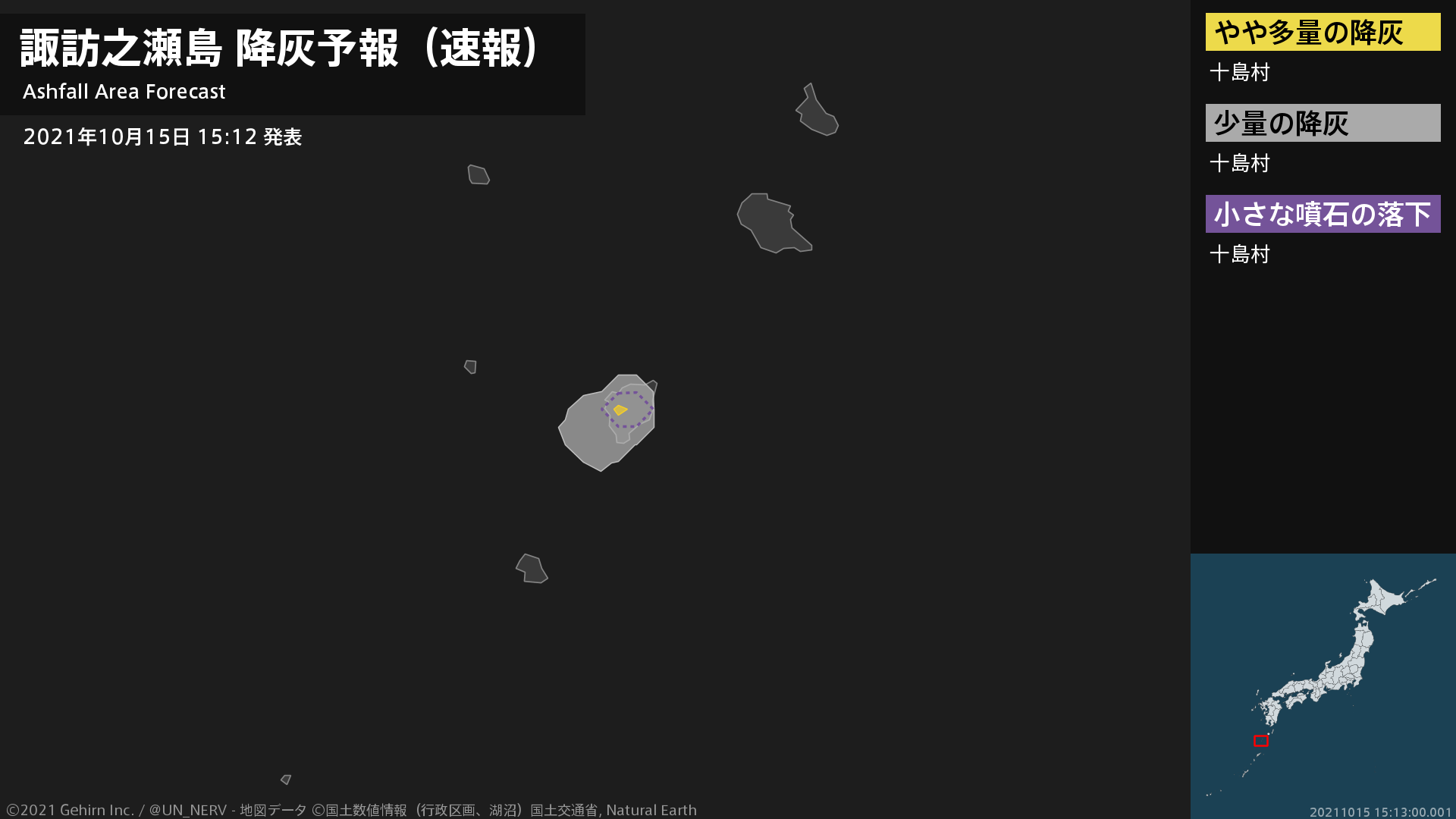 1時間以内に十島村ではやや多量の降灰があり、降灰は鹿児島県十島村まで予想されます。また、火口から南方向およそ3kmまでの範囲では、小さな噴石が風に流されて降るおそれがあります。