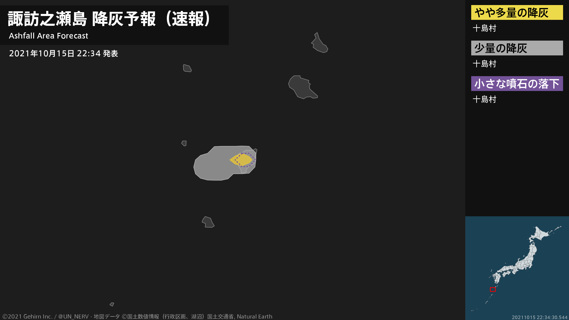 1時間以内に十島村ではやや多量の降灰があり、降灰は鹿児島県十島村まで予想されます。また、火口から西方向およそ3kmまでの範囲では、小さな噴石が風に流されて降るおそれがあります。