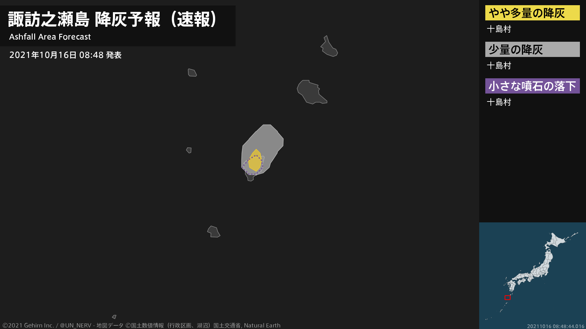 【諏訪之瀬島 降灰予報(速報)】1時間以内に十島村ではやや多量の降灰があり、降灰は鹿児島県十島村まで予想されます。また、火口から北方向およそ2kmまでの範囲では、小さな噴石が風に流されて降るおそれがあります。#降灰予報(速報)