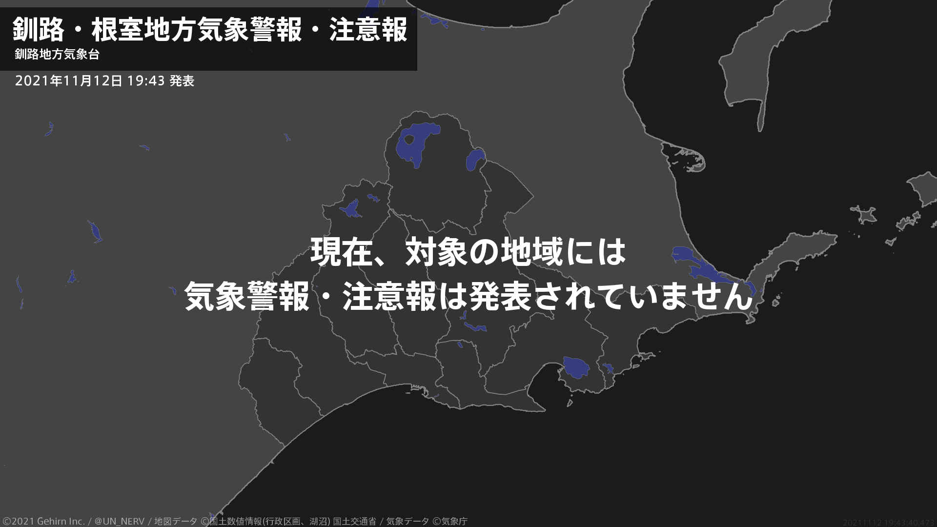 【釧路・根室地方 気象警報・注意報 2021年11月12日 19:43】注意報を解除します。#気象警報注意報 #釧路地方