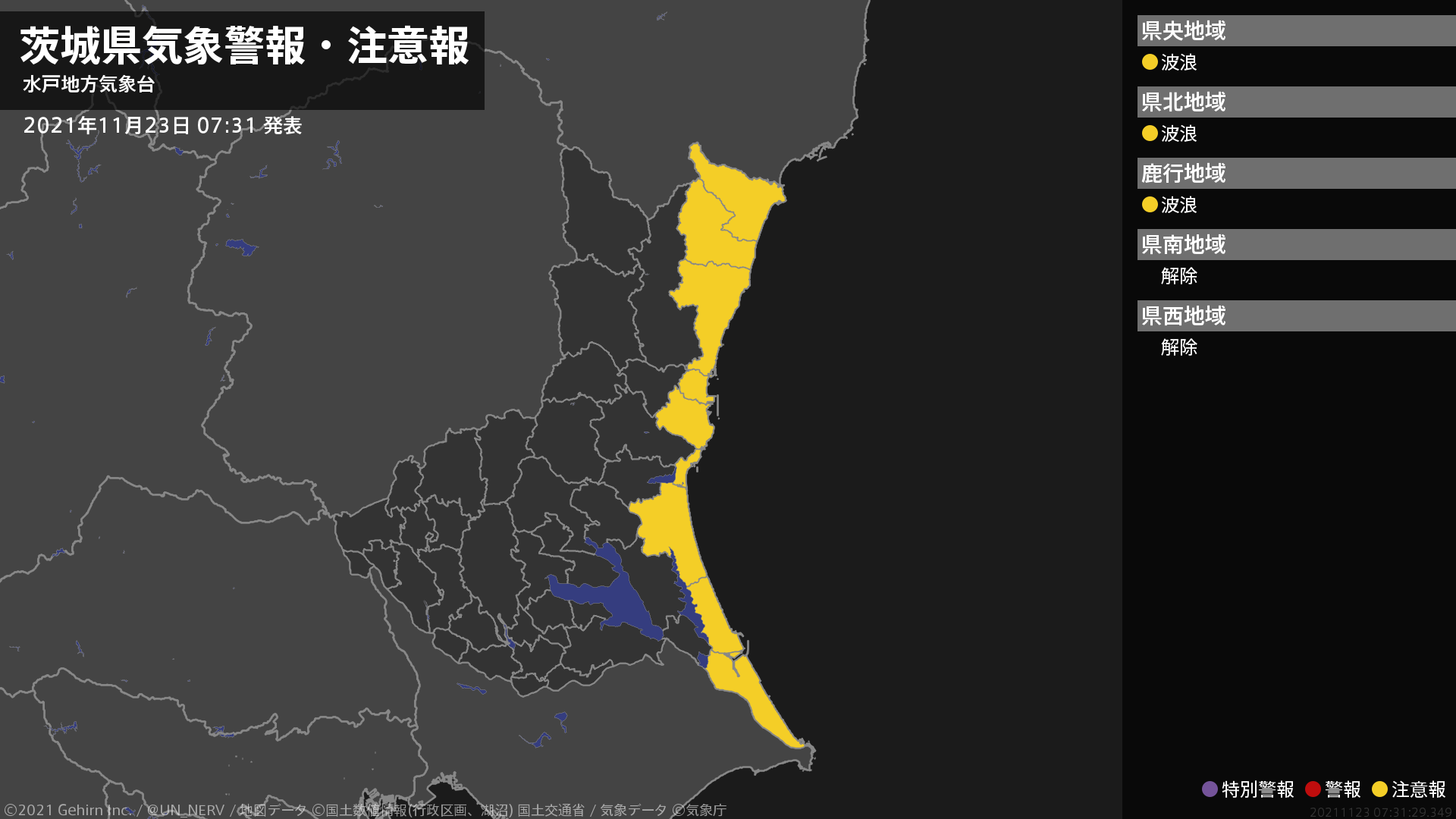 【茨城県 気象警報・注意報 2021年11月23日 07:31】茨城県では、高波に注意してください。#気象警報注意報 #茨城県