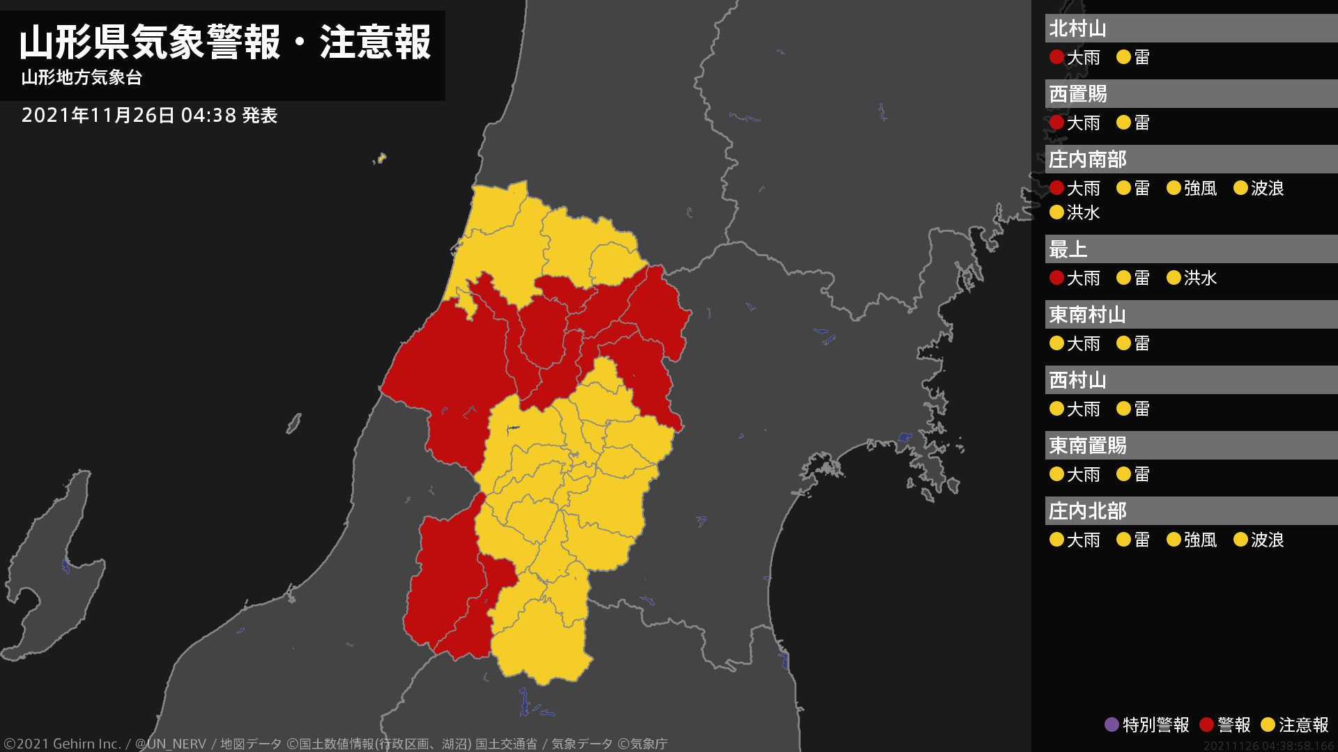【山形県 気象警報・注意報 2021年11月26日 04:38】山形県では、26日夕方まで土砂災害に警戒してください。#気象警報注意報 #山形県