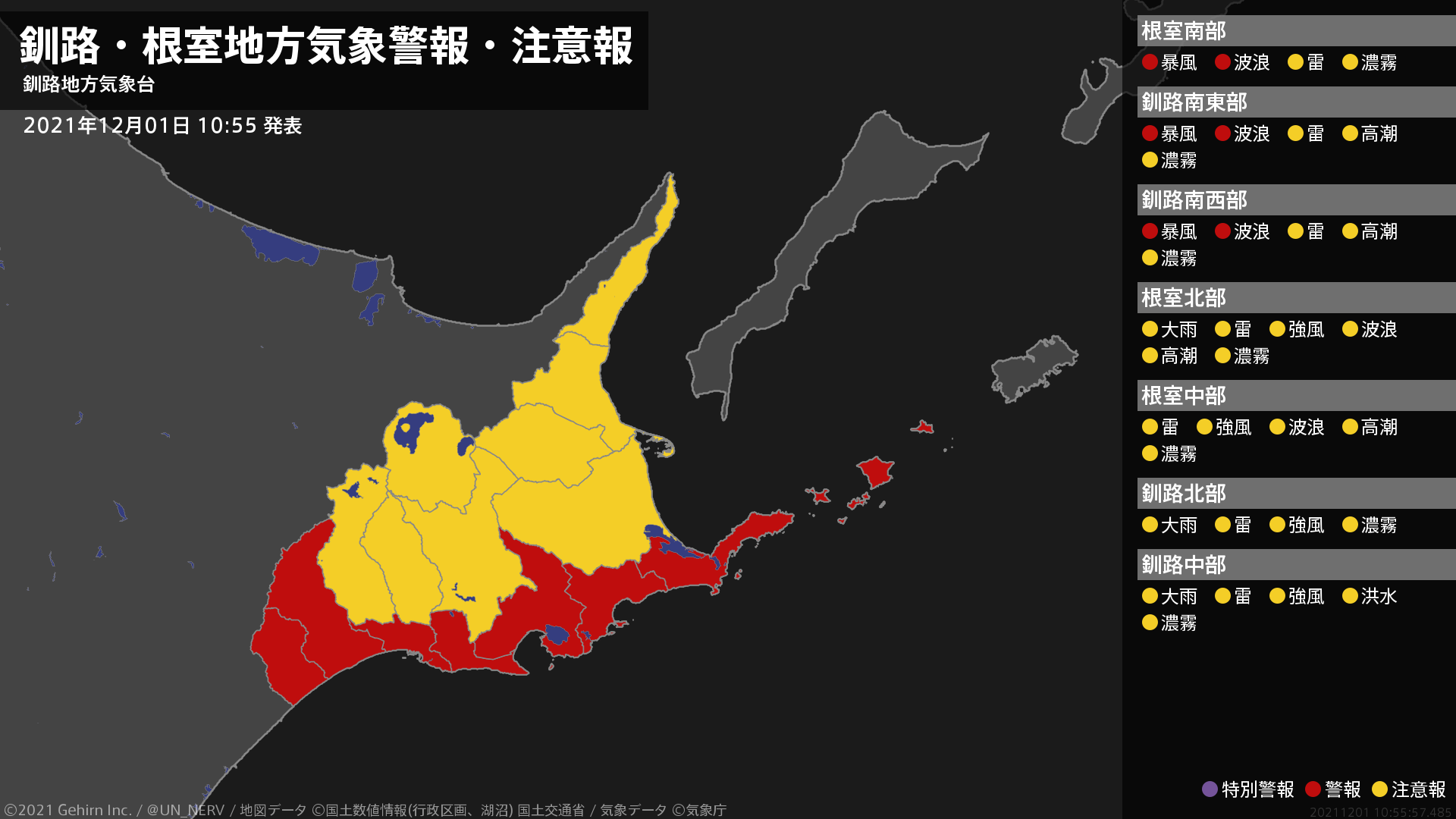 【釧路・根室地方 気象警報・注意報 2021年12月01日 10:55】根室地方では1日昼過ぎまで、釧路地方では2日明け方まで、暴風に警戒してください。根室、釧路地方では、2日昼前まで高波に警戒してください。#気象警報注意報 #根室地方 #釧路地方