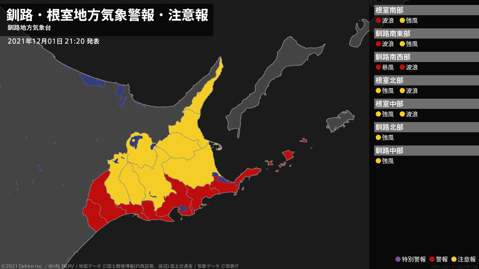 【釧路・根室地方 気象警報・注意報 2021年12月01日 21:20】
