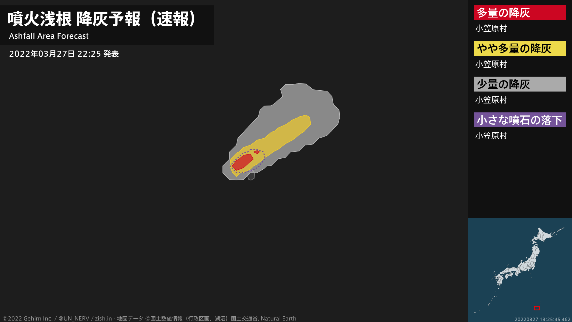1時間以内に小笠原村では多量の降灰があり、降灰は東京都小笠原村まで予想されます。また、火口から北東方向およそ9kmまでの範囲では、小さな噴石が風に流されて降るおそれがあります。
