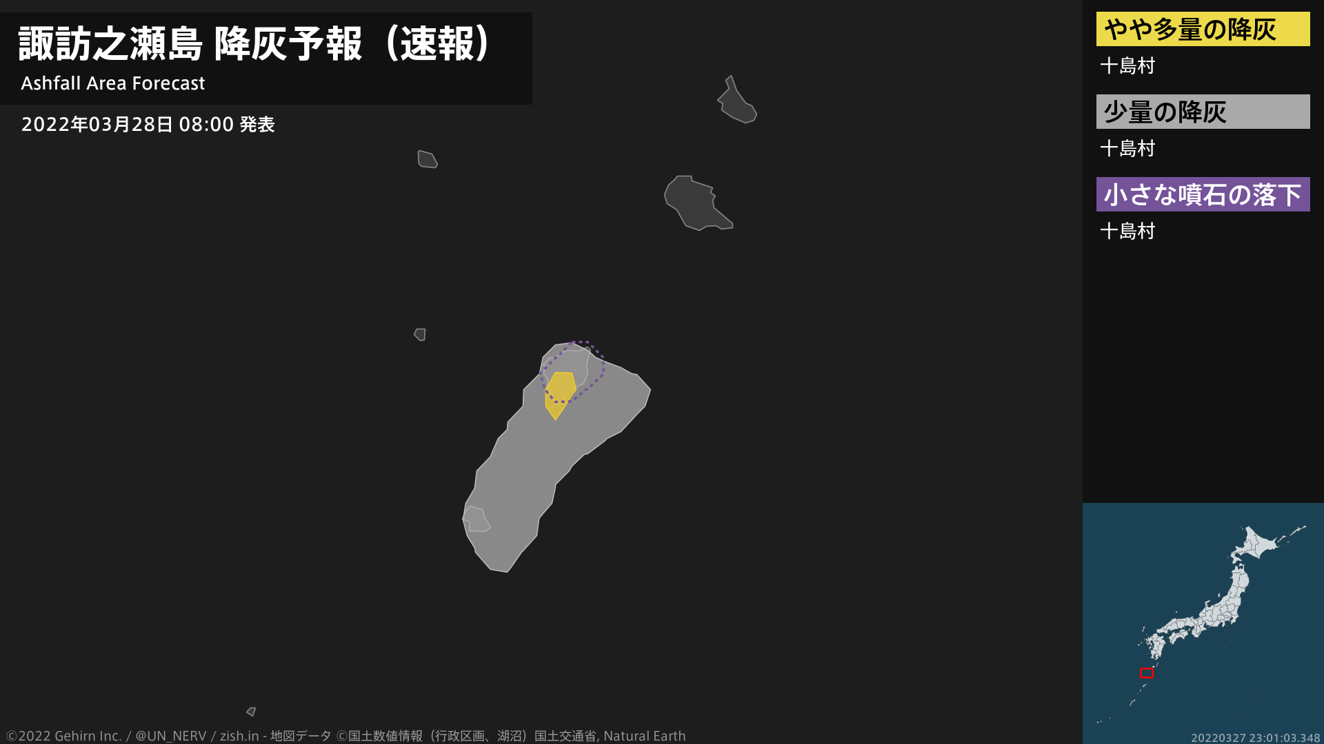 【諏訪之瀬島 降灰予報(速報)】1時間以内に十島村ではやや多量の降灰があり、降灰は鹿児島県十島村まで予想されます。また、火口から東方向およそ3kmまでの範囲では、小さな噴石が風に流されて降るおそれがあります。#降灰予報(速報)