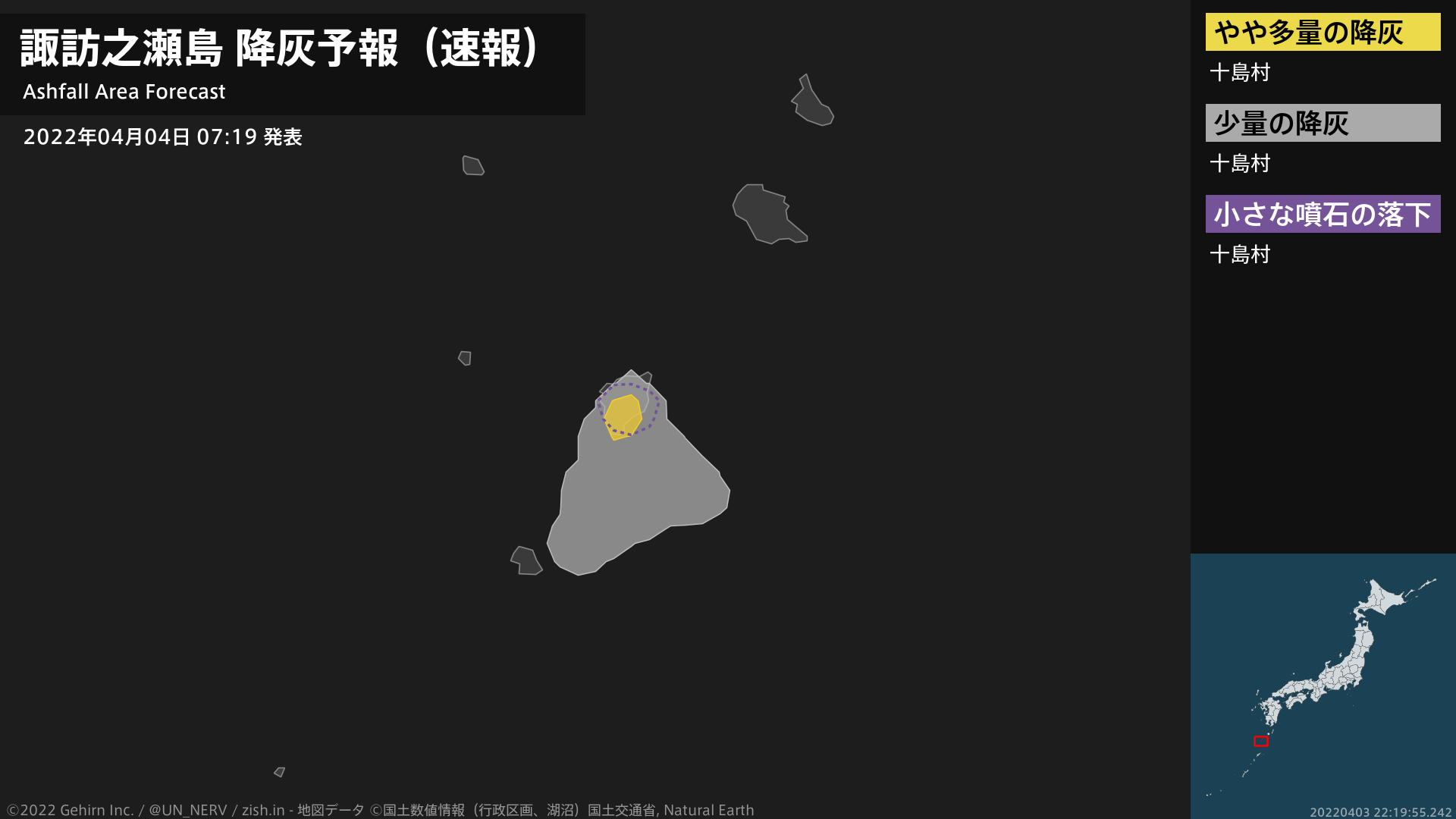 【諏訪之瀬島 降灰予報(速報)】1時間以内に十島村ではやや多量の降灰があり、降灰は鹿児島県十島村まで予想されます。また、火口から南東方向およそ4kmまでの範囲では、小さな噴石が風に流されて降るおそれがあります。#降灰予報(速報)