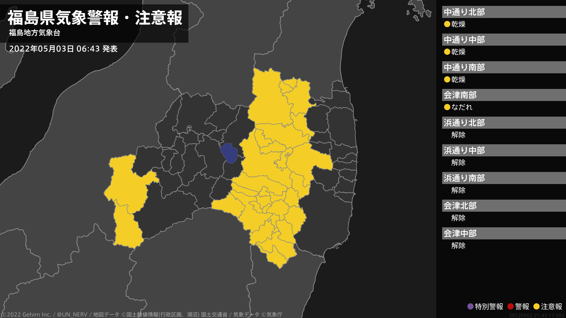 【福島県 気象警報・注意報 2022年05月03日 06:43】中通りでは、5日まで空気の乾燥した状態が続くため、火の取り扱いに注意してください。会津では、ここしばらくなだれに注意してください。#気象警報注意報 #福島県