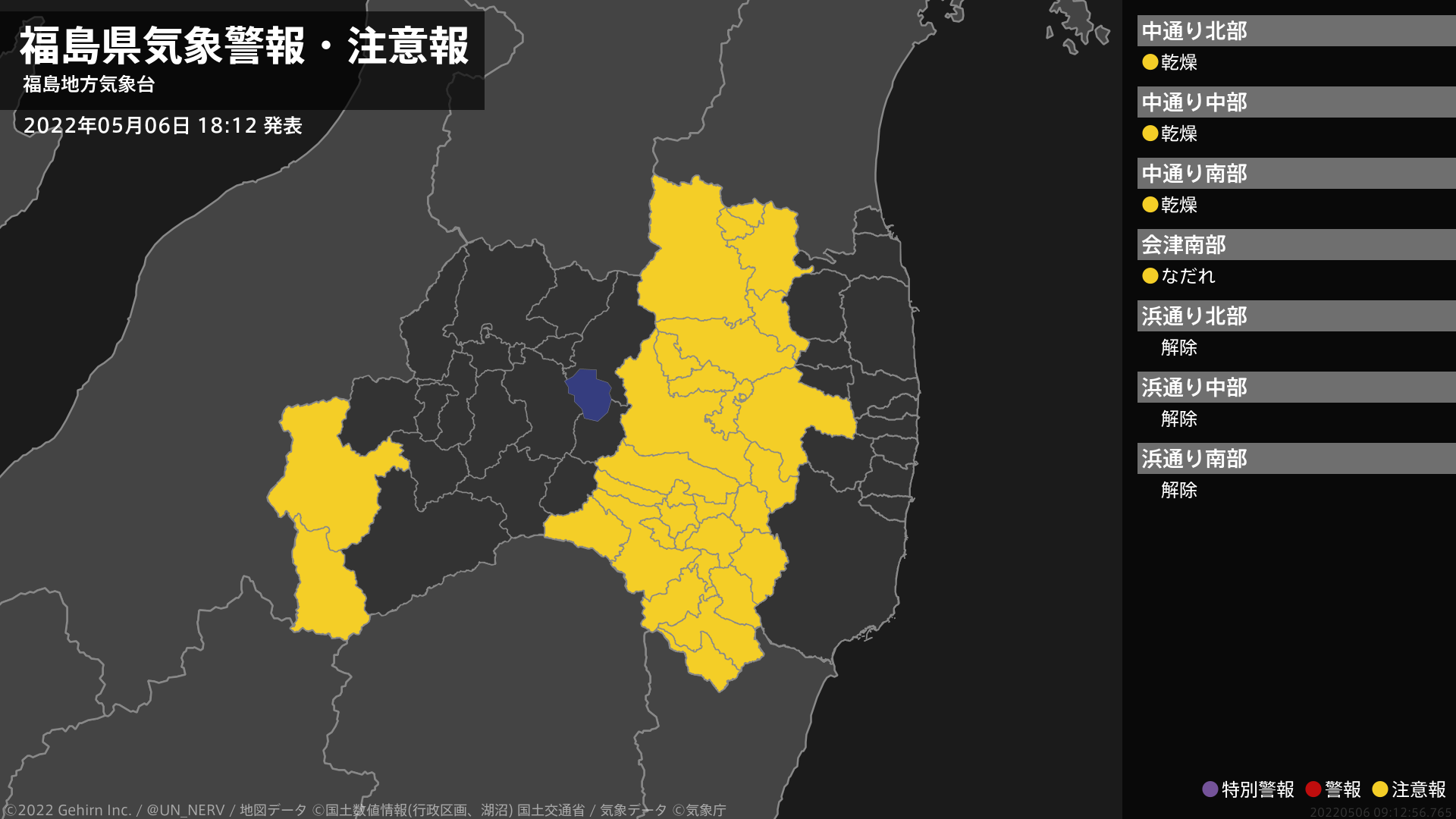 【福島県 気象警報・注意報 2022年05月06日 18:12】中通りでは、6日まで空気の乾燥した状態が続くため、火の取り扱いに注意してください。会津では、ここしばらくなだれに注意してください。#気象警報注意報 #福島県