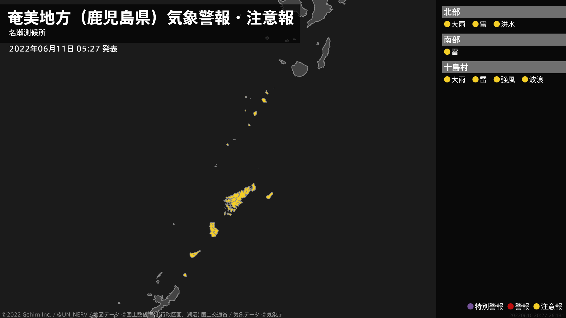 【奄美地方(鹿児島県) 気象警報・注意報 2022年06月11日 06:15】奄美地方では、土砂災害や低い土地の浸水、河川の増水、強風、高波、竜巻などの激しい突風、落雷に注意してください。#気象警報注意報 #奄美地方