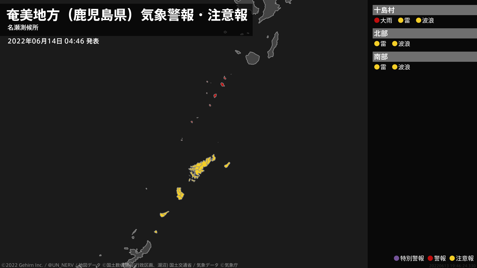 【奄美地方(鹿児島県) 気象警報・注意報 2022年06月14日 04:46】奄美地方では、14日夕方まで土砂災害に警戒してください。#気象警報注意報 #奄美地方