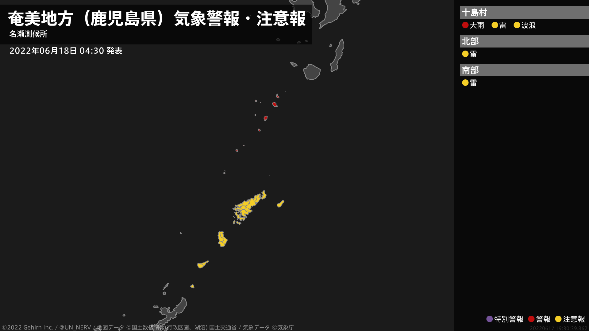 【奄美地方(鹿児島県) 気象情報 2022年06月18日 05:00】十島村では、18日夕方にかけて土砂災害に警戒してください。また、奄美地方では、18日夕方にかけて落雷や竜巻などの激しい突風に注意してください。#気象情報 #奄美地方(鹿児島県)