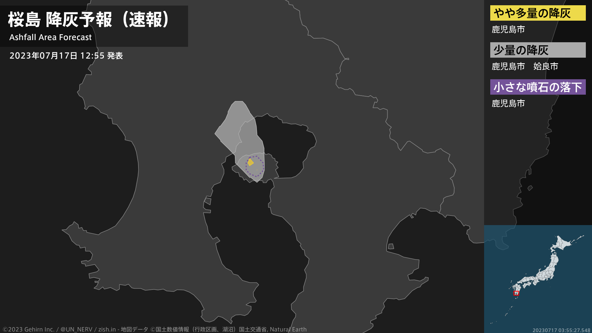 【桜島 降灰予報(速報)】1時間以内に鹿児島市(桜島)ではやや多量の降灰があり、降灰は鹿児島県姶良市まで予想されます。また、火口から北西方向およそ3kmまでの範囲では、小さな噴石が風に流されて降るおそれがあります。#降灰予報(速報)